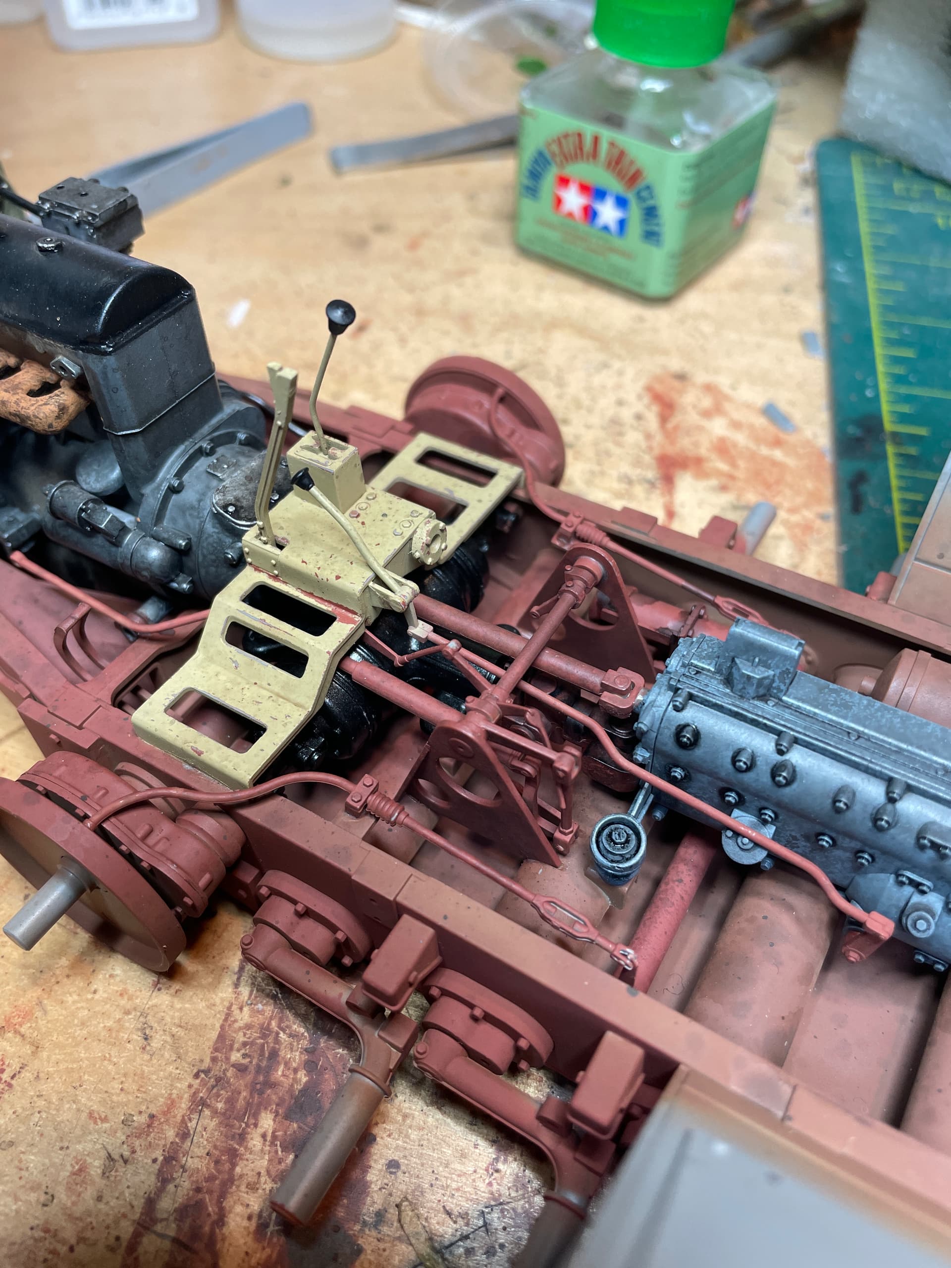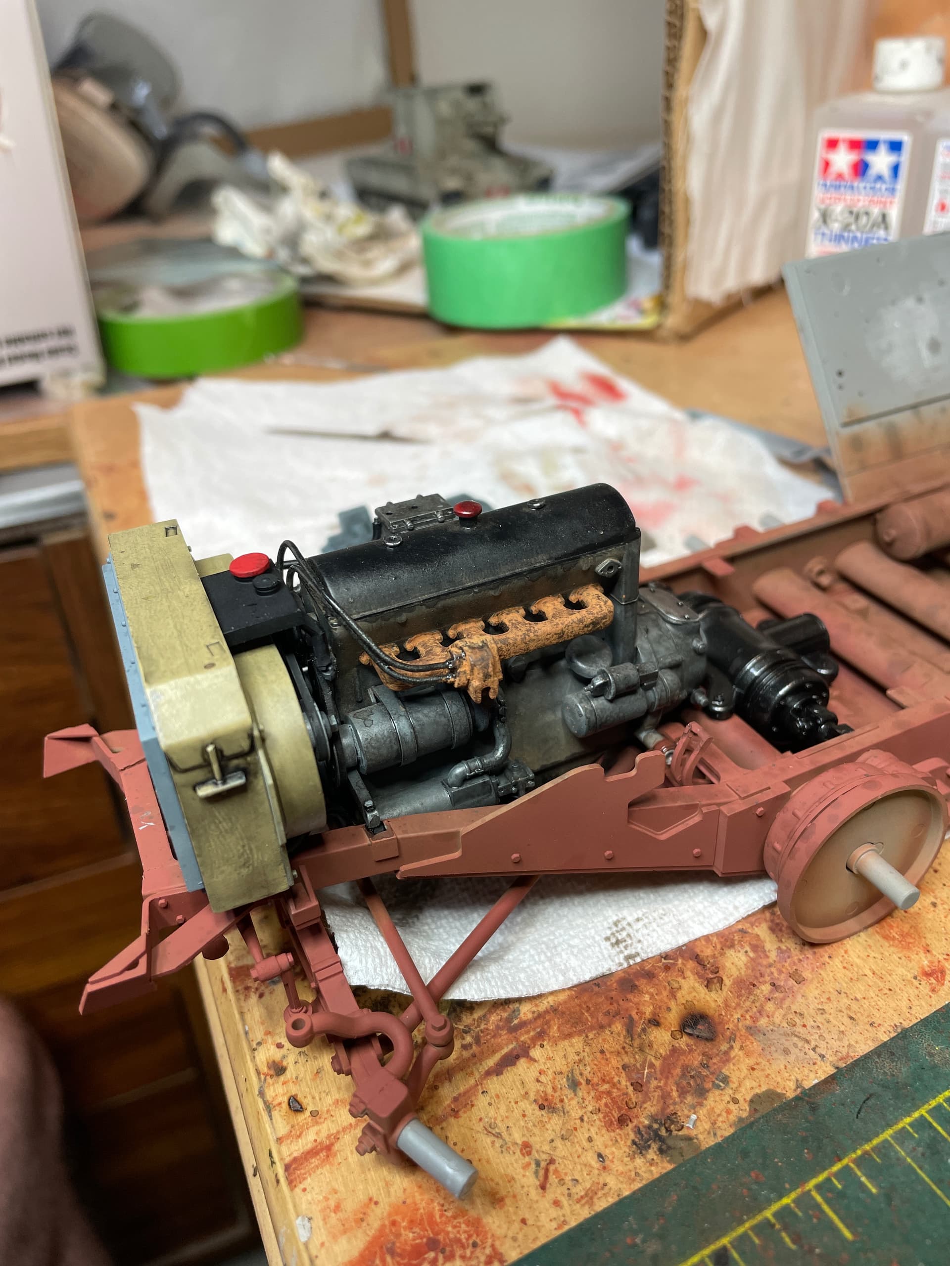 A little bit of progress, mounted the engine and radiator on the chassis and ordered some sagged wheels from AFV modeller.