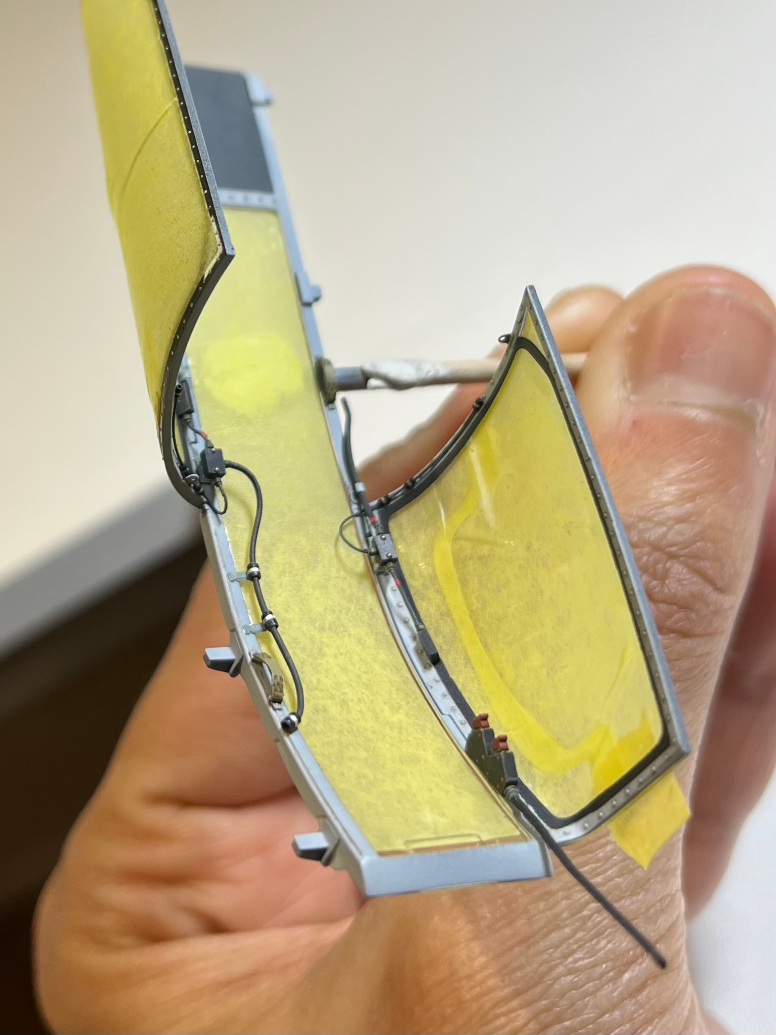 Finished up internal wiring for the canopy, I think these wires are for the canopy charges. Once the canopy is mounted I’ll connect the wiring on the side pillars to loose wires on the side of the pilots instrument panel coming. We also need to connect two of the wires to the open doors which will be fixed on after painting the fuselage.