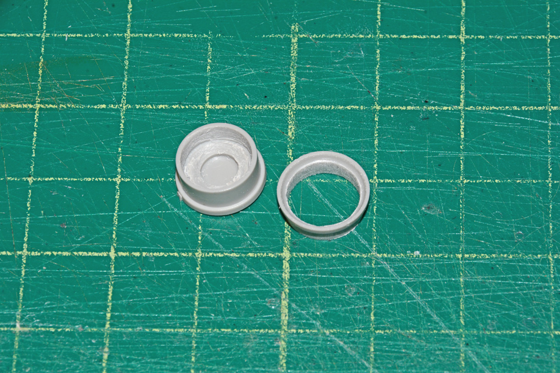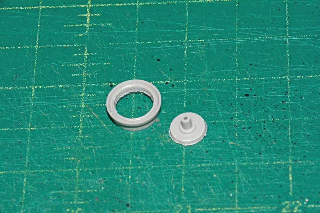 The kit allows for posable but not moveable steering - that is, you can set it left, right or centered, and as I wanted to leave it adjustable when done, I made up some relatively fussy upper and lower ball joint assemblies - in brief, horseshoes of styrene that serve as retainers for the ball joint pins provided in the kit, as shown in the picture on the right. This is not as hard per se as it sounds, but it is pretty tricky, as you want to firmly attach the horseshoe, but not get any glue on the ball joint pin.