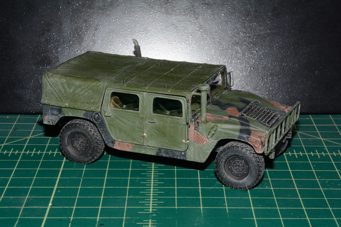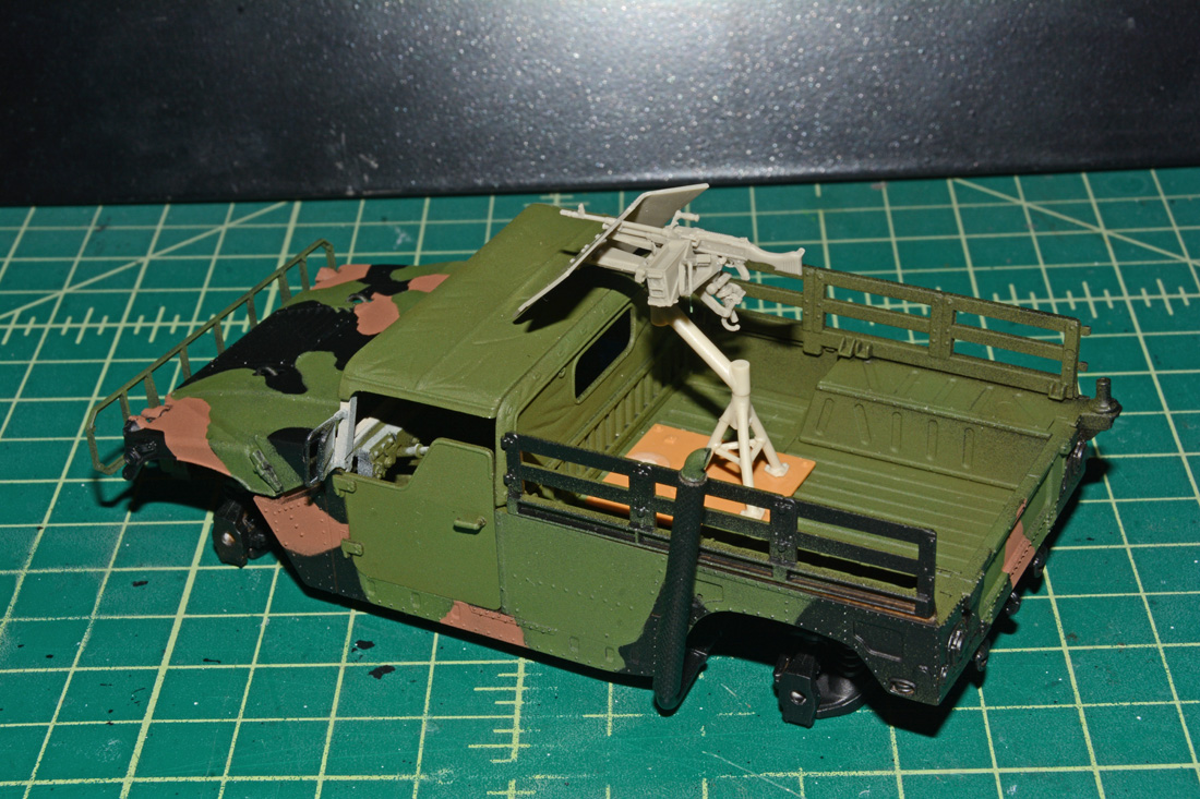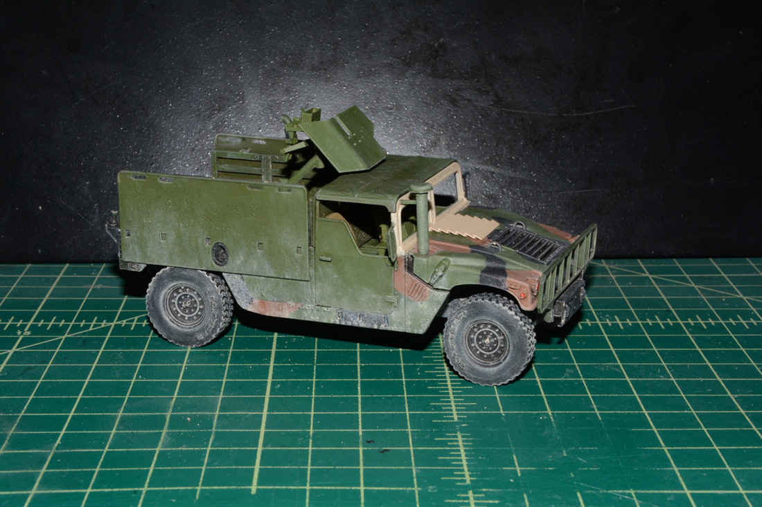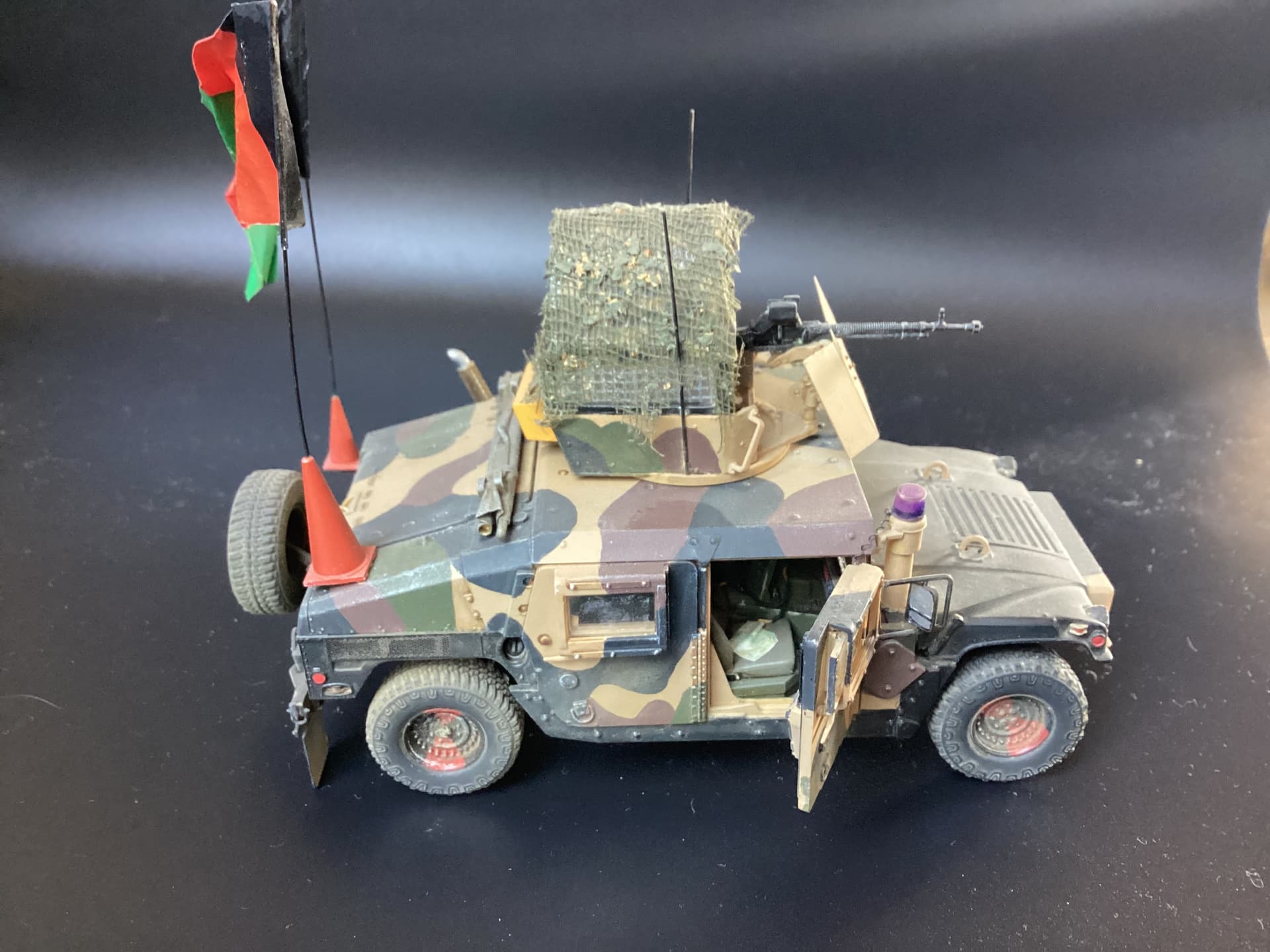 Here is a Tamiya M1025 I converted to an M1043 with the tea cup turret and half moon doors. I scratch built them from plastic card. Not done yet, still working on the weathering. I heated the scratch built tea cup part in hot water then placed in a jar to keep the curve.
