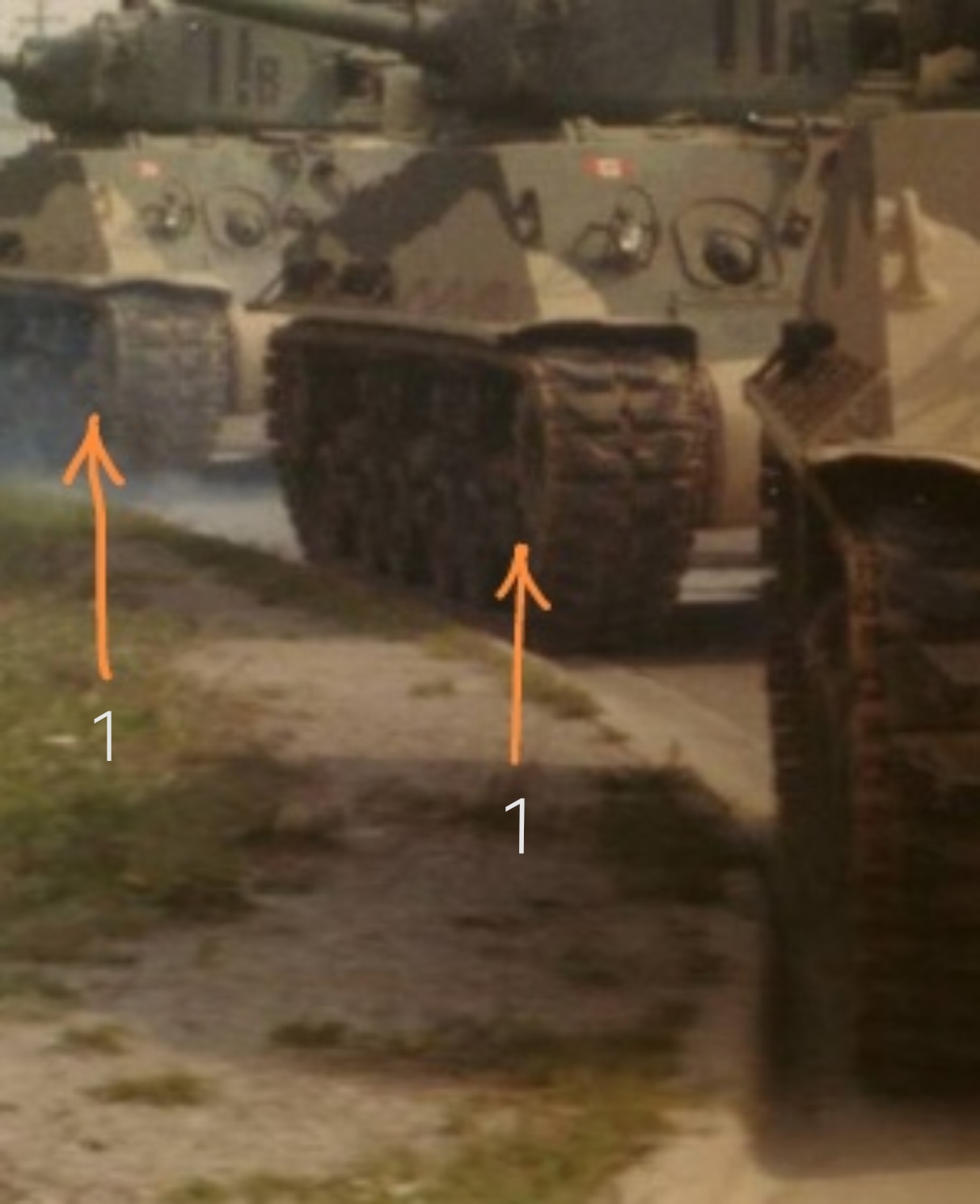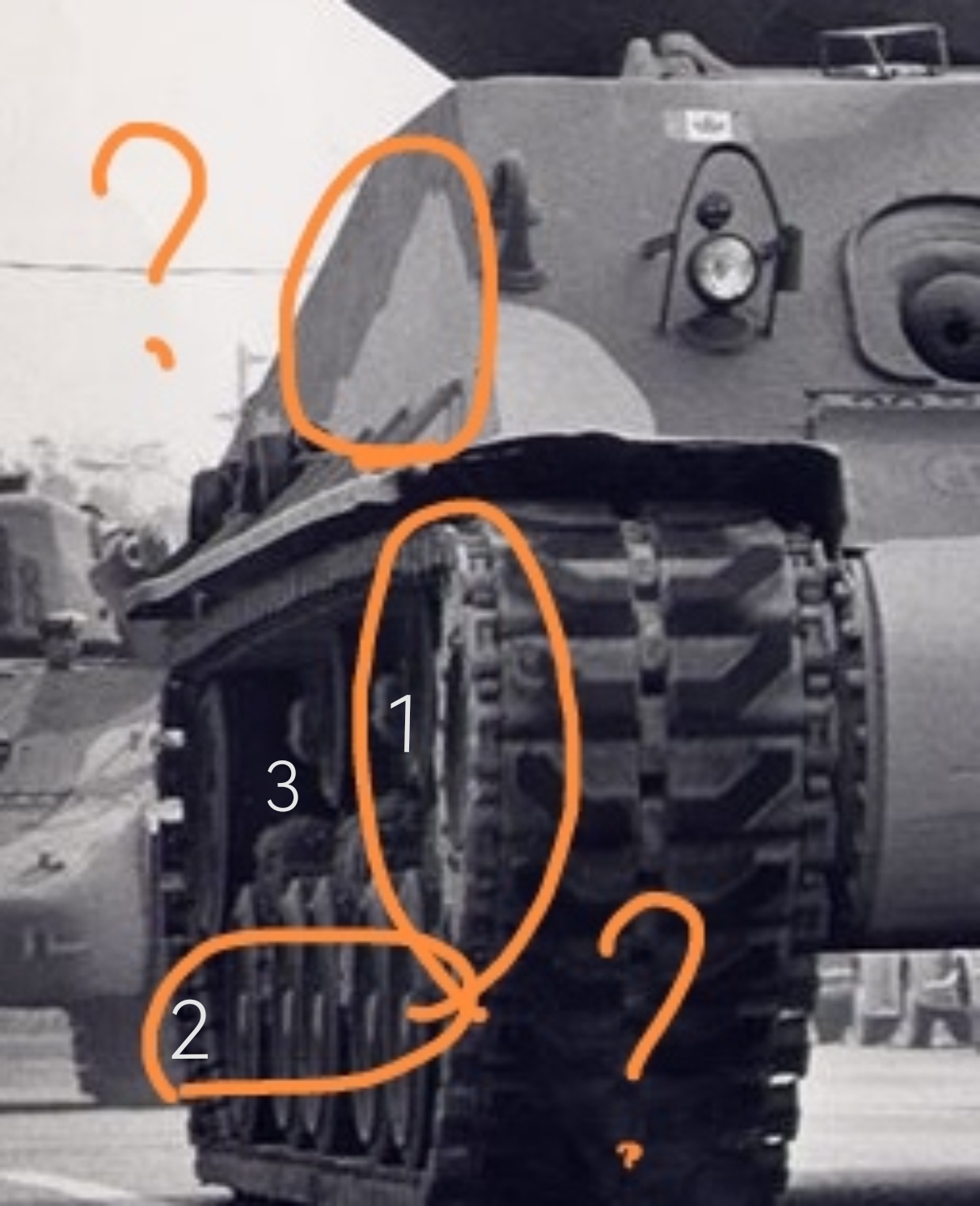 The second is the paint color of the wheels. Since I didn’t find enough photos to prove the color of the wheels, I could only speculate on the available photos. (1) The drive wheel is still relatively easy to judge, because whether from the color photo or black and white photo, it can be clearly seen that the drive wheel is a very light color, and it can be seen from the color photo that it is relatively close to the sand color at the bottom of the hull. So the drive wheel should be the same light sand color. (3) From the color exposed by the suspension, it is almost certain that the HVSS suspension is dark color, that is, the traditional conventional olive brown. However, (2) the road wheel is difficult to judge because there is too little exposed. Only a little of the axle cover is exposed, and although it seems to be a light color, it is impossible to tell if it is a highlight effect or whether the axle cover and the wheel are the same color. The same problem exists in the idler wheel cannot be judged. But the road wheels and the idler wheel are really difficult to judge, I hope any friends who know can help me answer the color of these wheels, thank you.