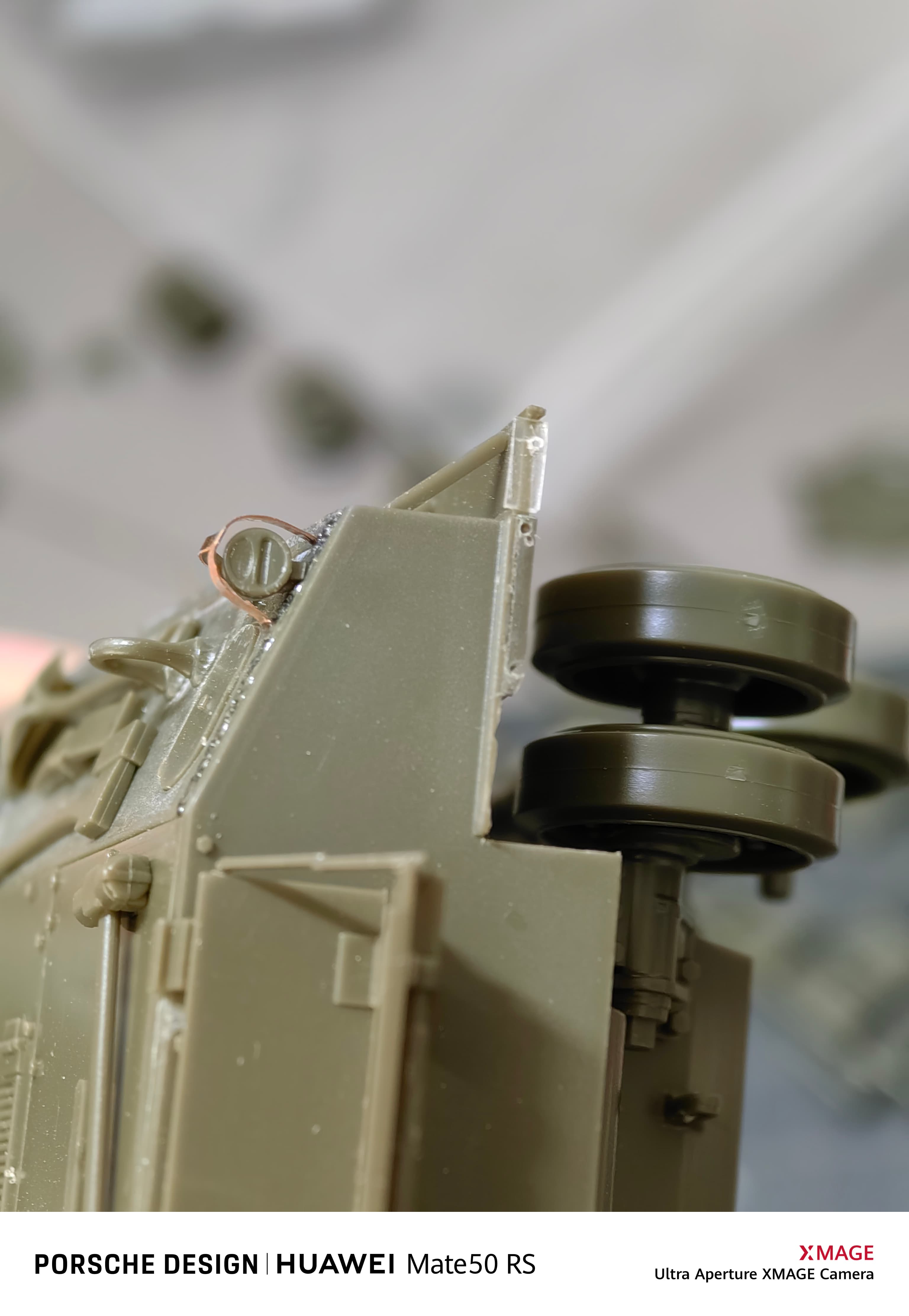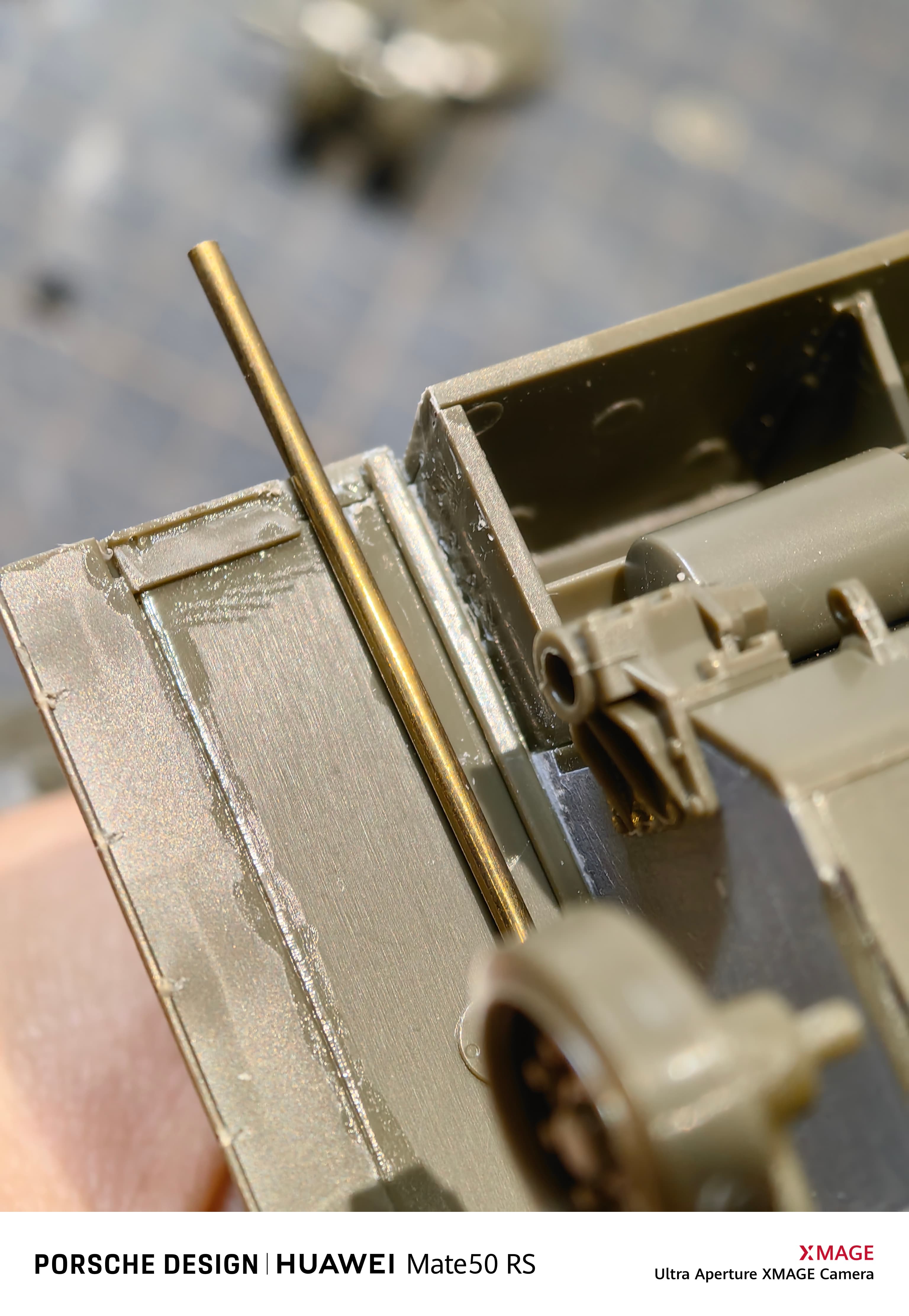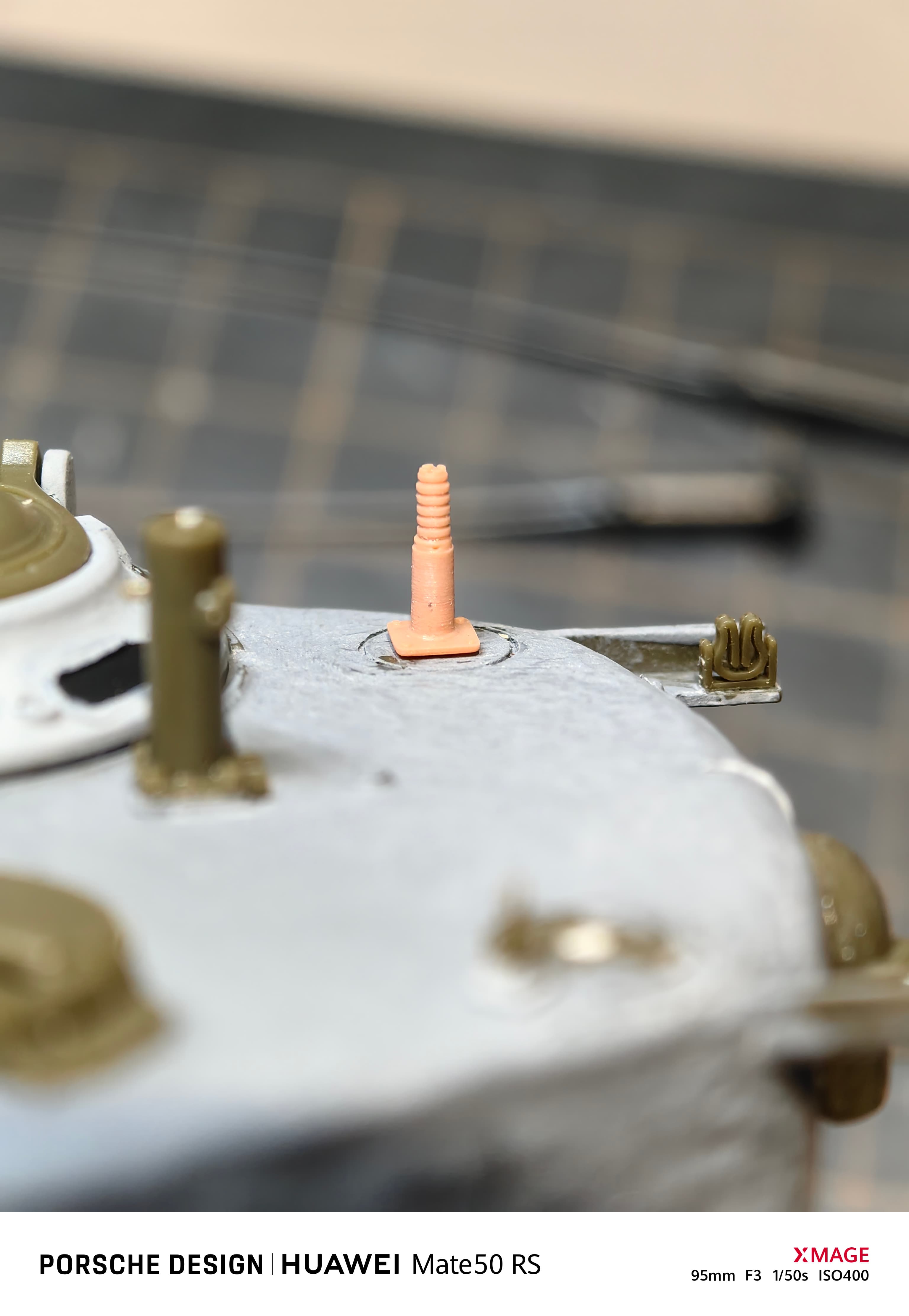 In these days, I am slowly checking the photos of real tank to correct the details. Including the periscope guards, the tail tube, the rear fender and the antenna base. For the periscope guards, I used a TREX 3D printed set because it is thin enough and the cross section is round rather than the wrong rectangle like PE. These periscope guards are very thin and need to be removed and installed with great care. The other part of the set is the fastening of the steel cable. According to the history photos, there was no steel cable installed, so I glued these two fastening devices directly.