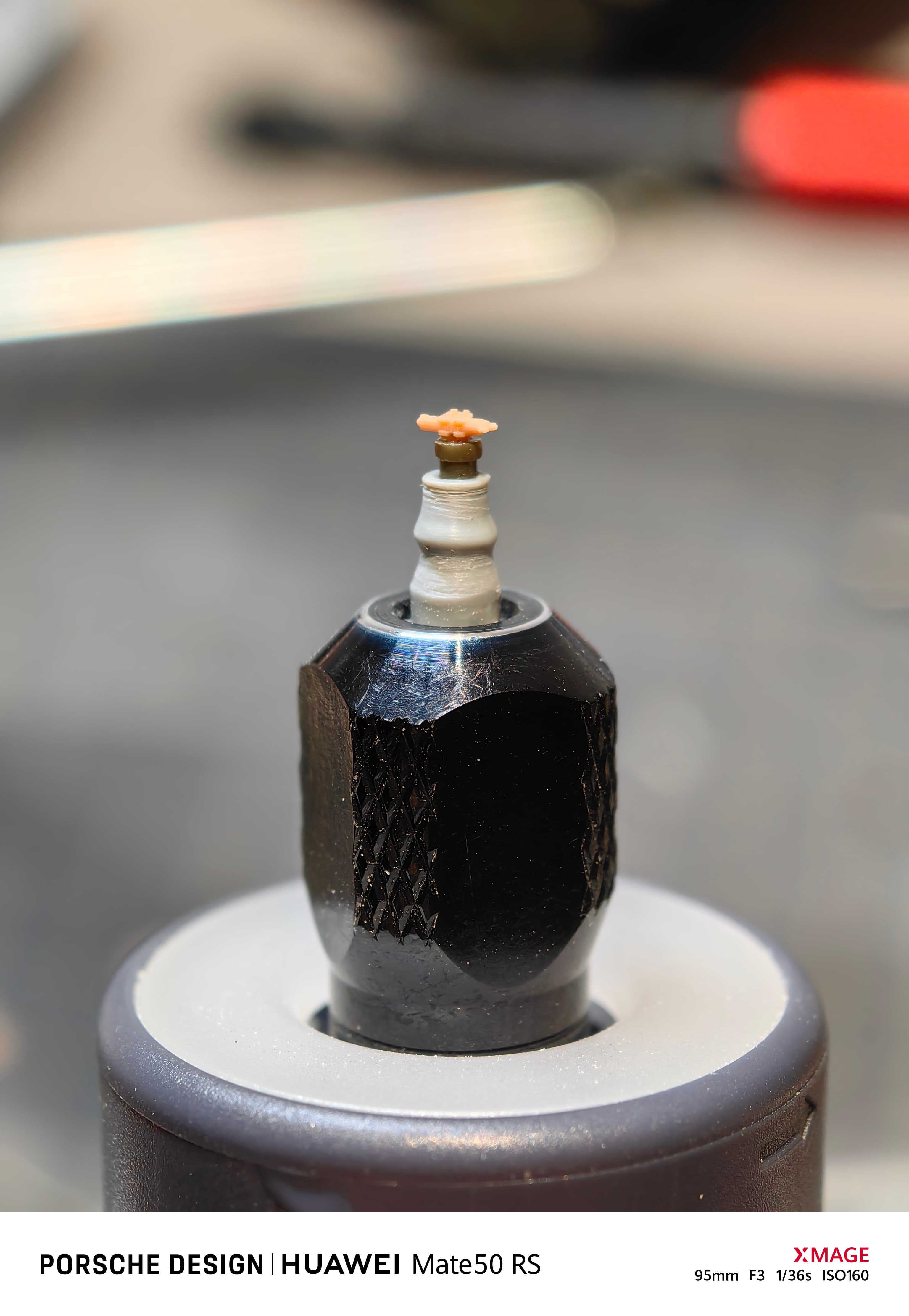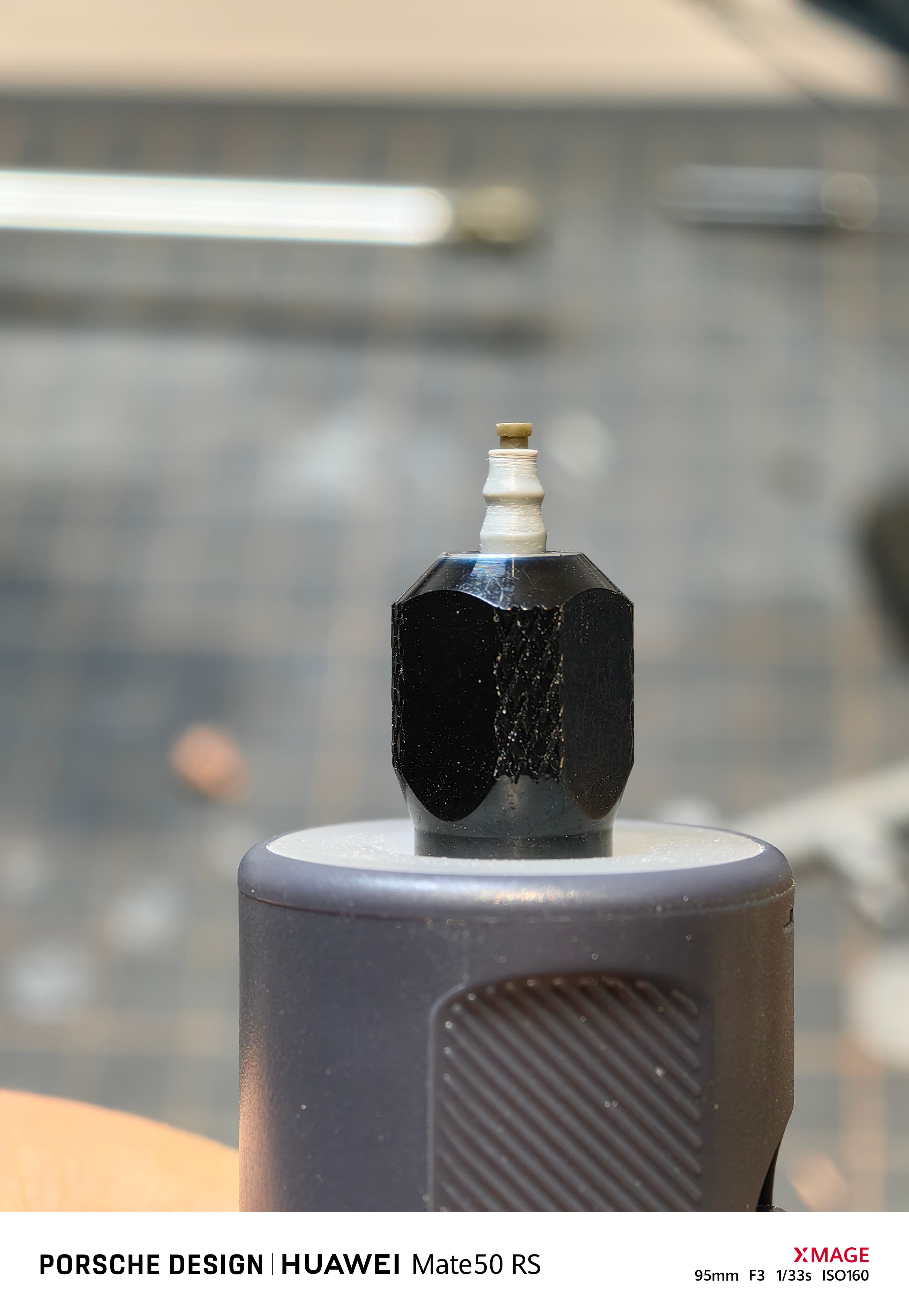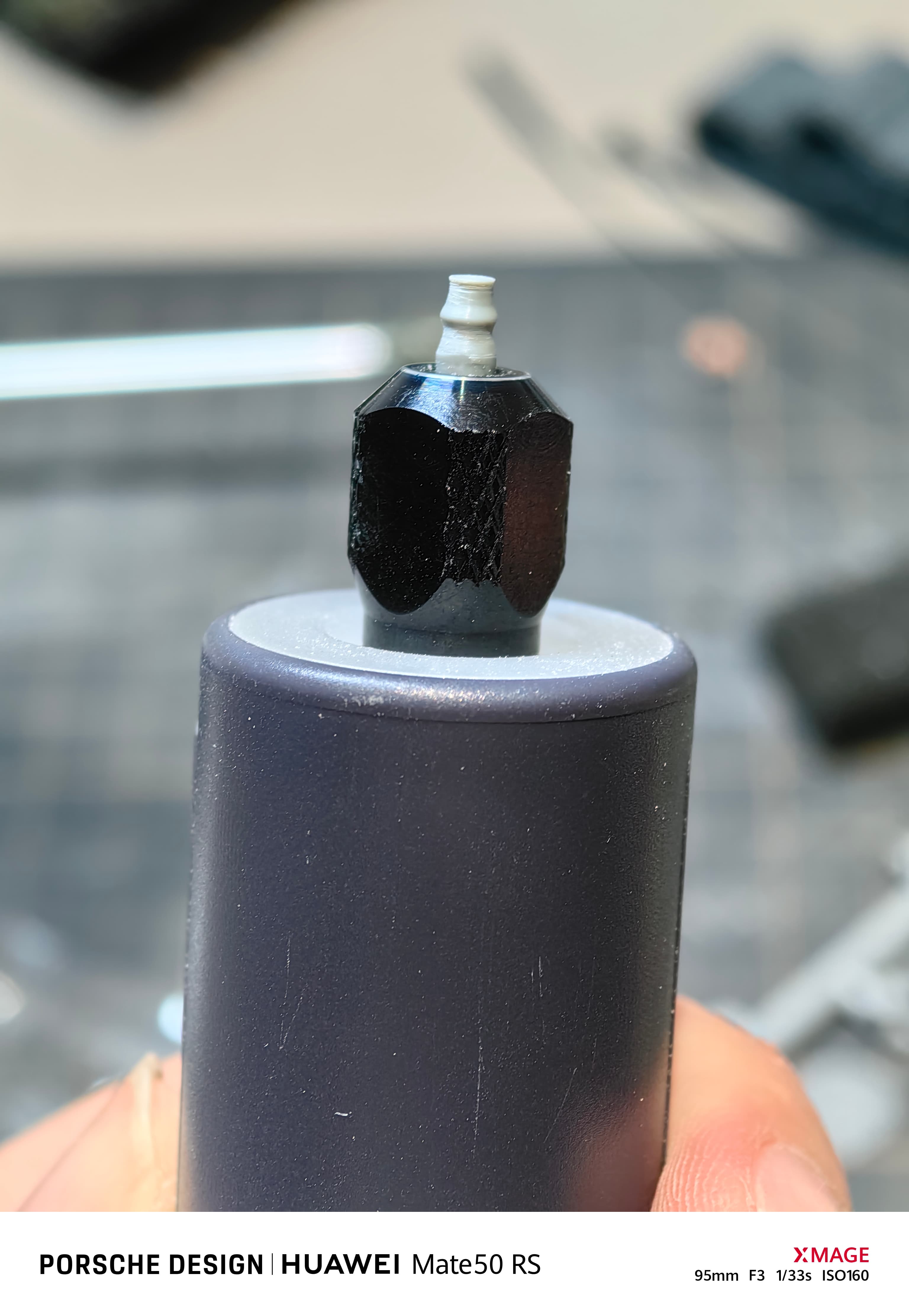 So I took a closer look at the shape of the antenna base is not very complicated, the key is that its main body is still a gourd-shaped rotating body. So I can grab a piece of plastic stick with a electric power tool and spin it at high speed with a hand-held file. This gourd-shaped antenna base can be made into a simple lathe. Finally, some other parts can be glued together to make this 19 antenna base, the finnal effect is OK.