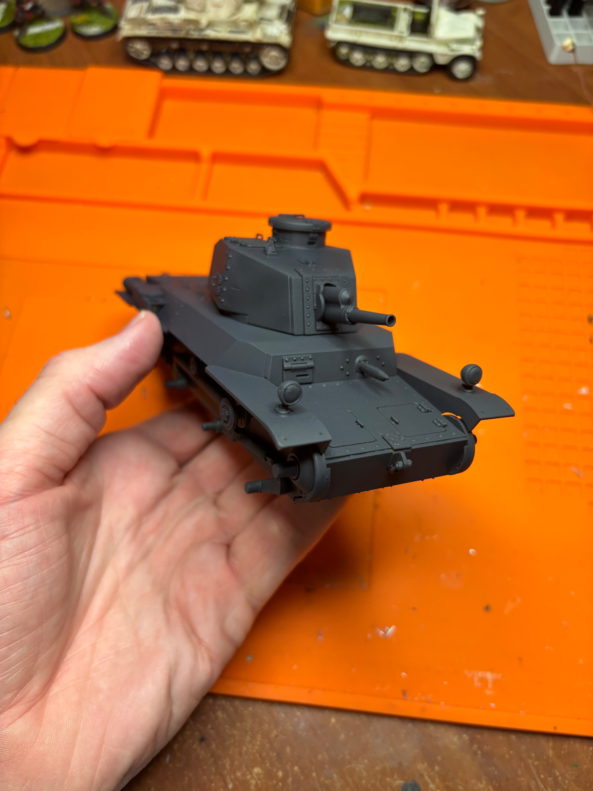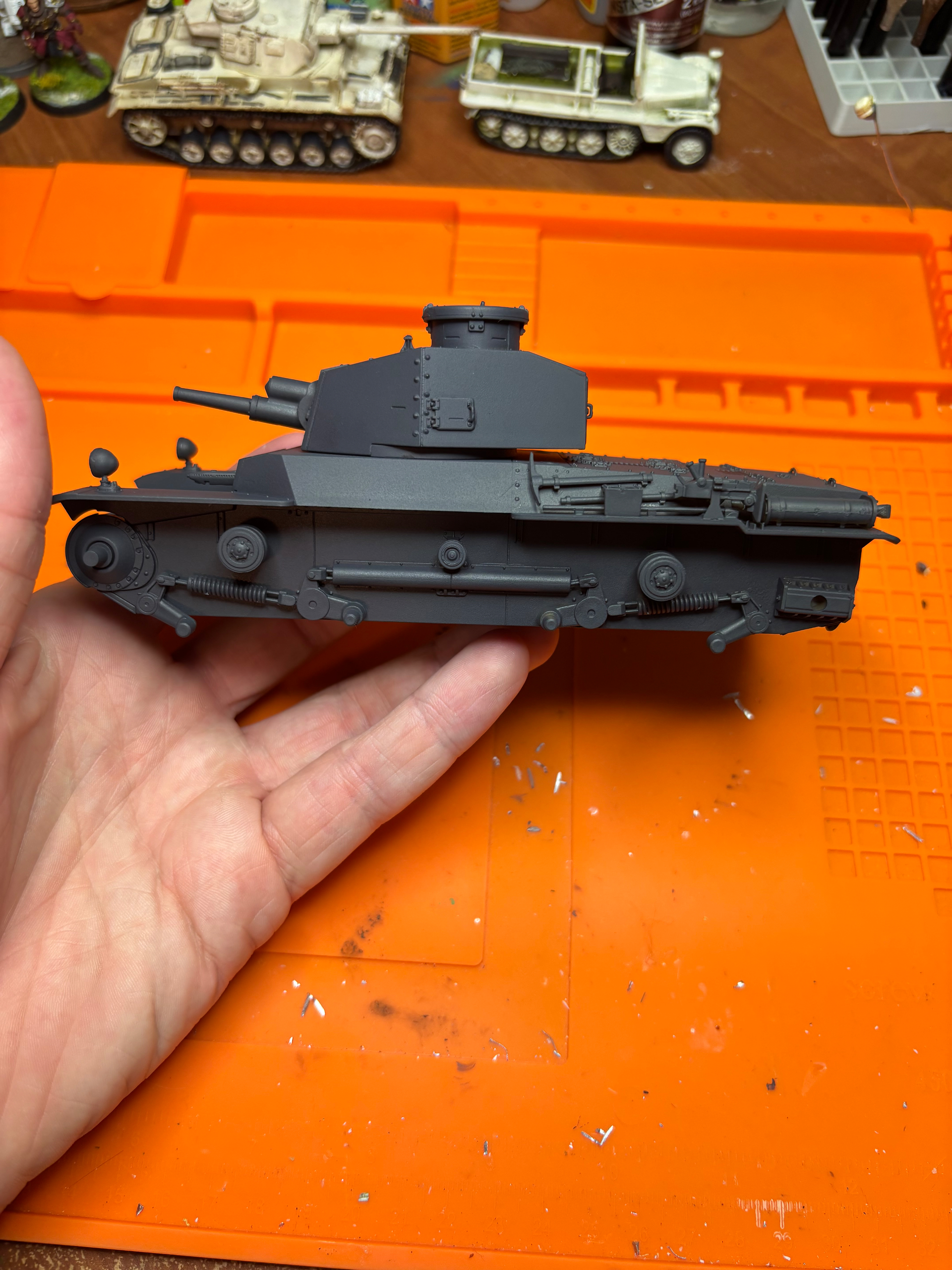 Not pictured are all the wheels, because I someone completely missed putting them on. But they are painted as well. For the color, I am leaning towards a plain green like my Chi Ha, but may try the 3 color brown pattern