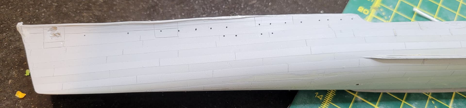To replicate this, I cut strips of paper soaked in glue to the estimated width, and also cut another paper section to the shape of the angled section to layer it. I also cut a small section to add the corner at the rear of the deck. A coat of Mr. Surfacer 1200 later and I had a much better-looking angled deck section.