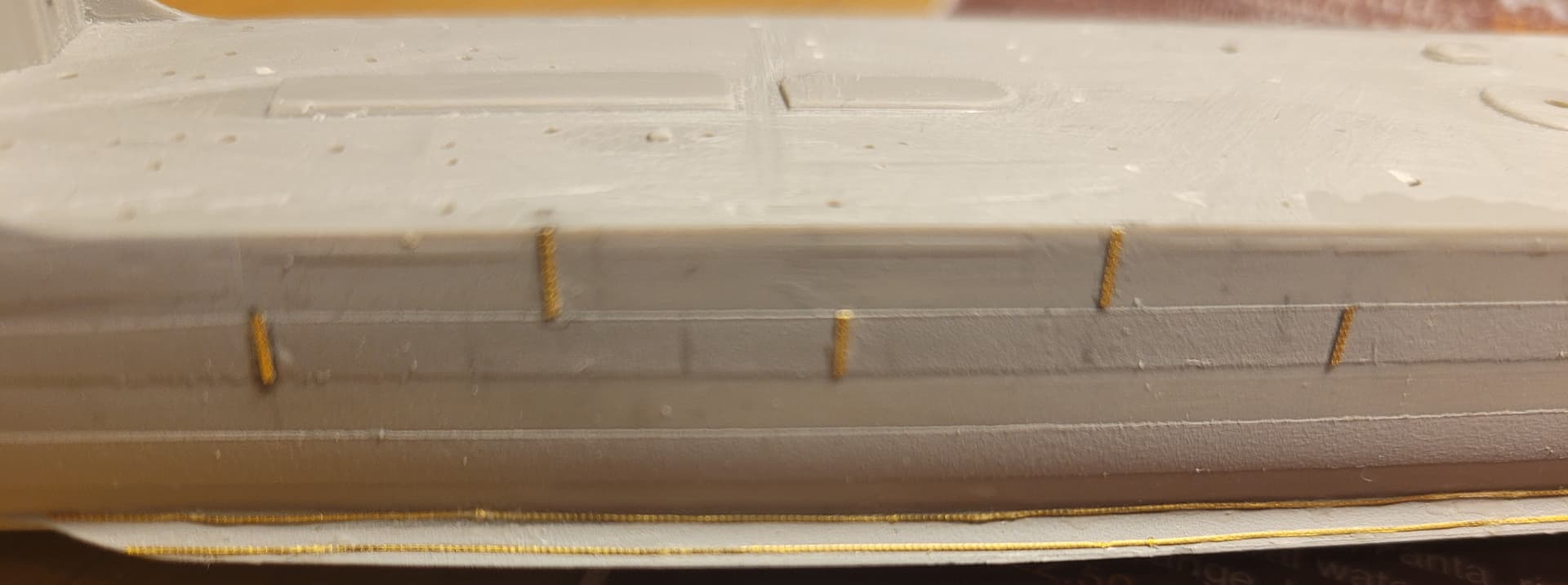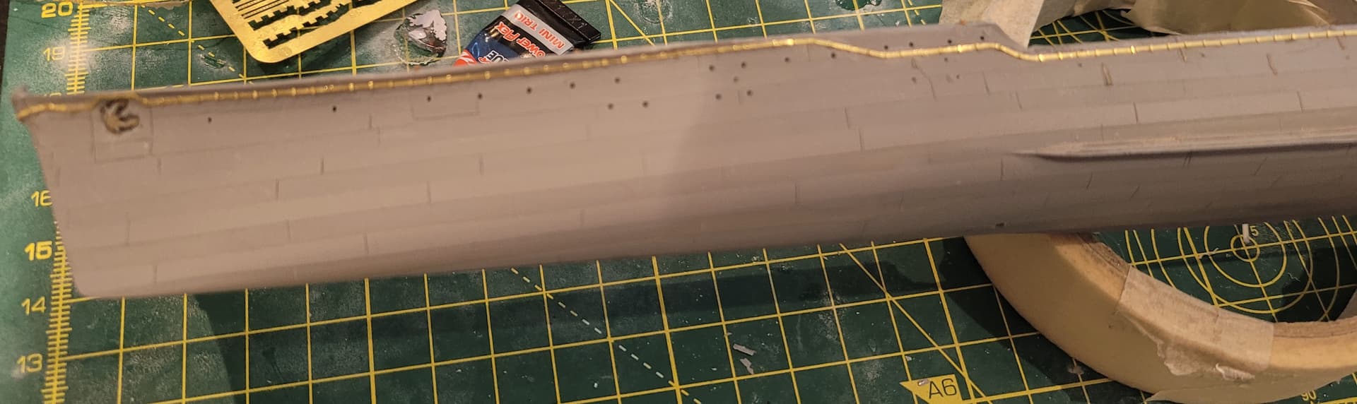 To fix both of these issues I sanded off all the deck left around the plate. Next, I ordered a 0.8 mm thick styrene sheet and cut thin strips to the estimated width of these side surfaces. I could then stick them across the edges of Fuyutsuki and blended the strips into the angled portion at the end of the deck. I also sanded a little to recreate the slight reduction in the width of these side walls as they approach the bow.