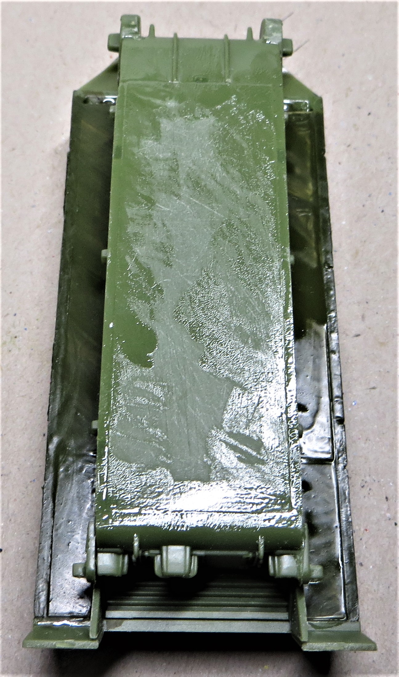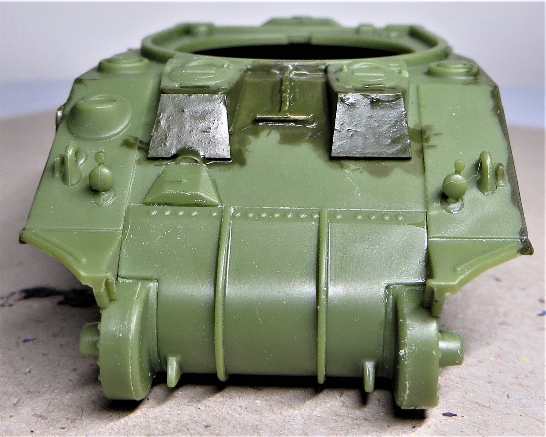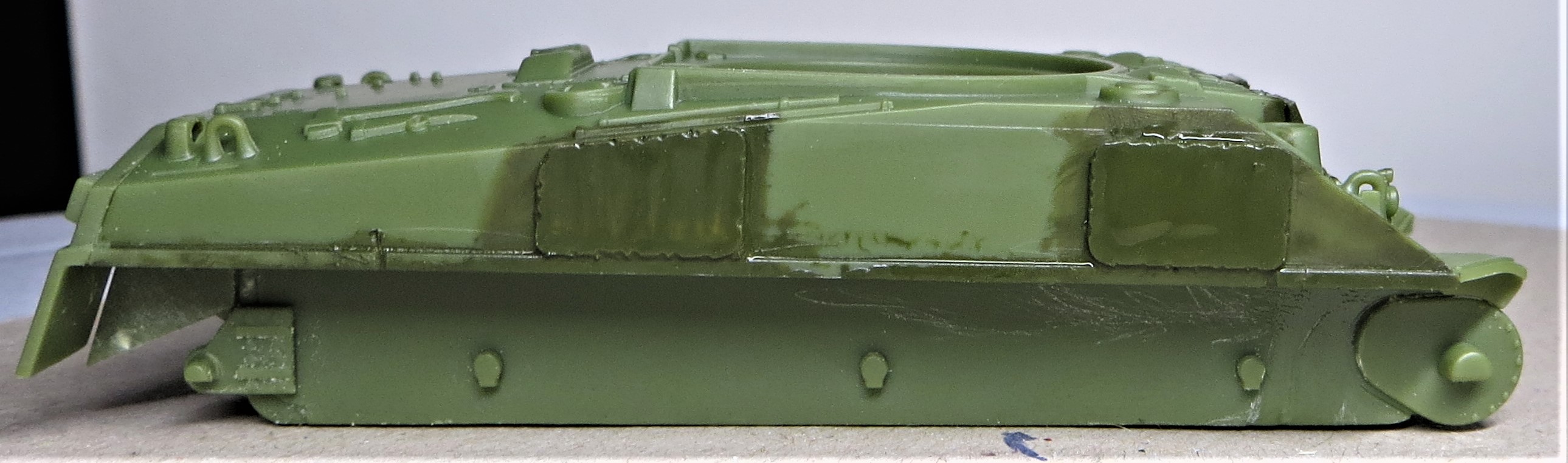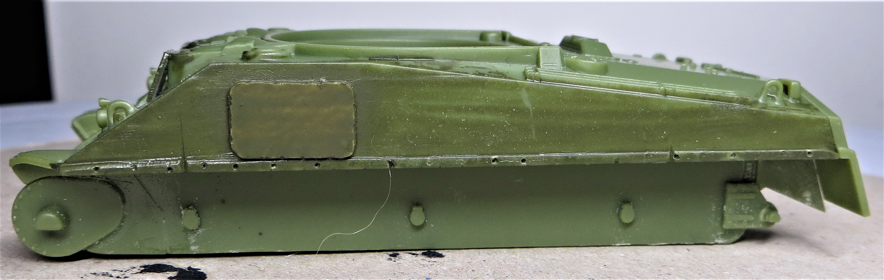 I decided to add some applique armour to the hull sides and the front of hull hatches. These are not included in the kit but are simply cobbled together from plastic card.