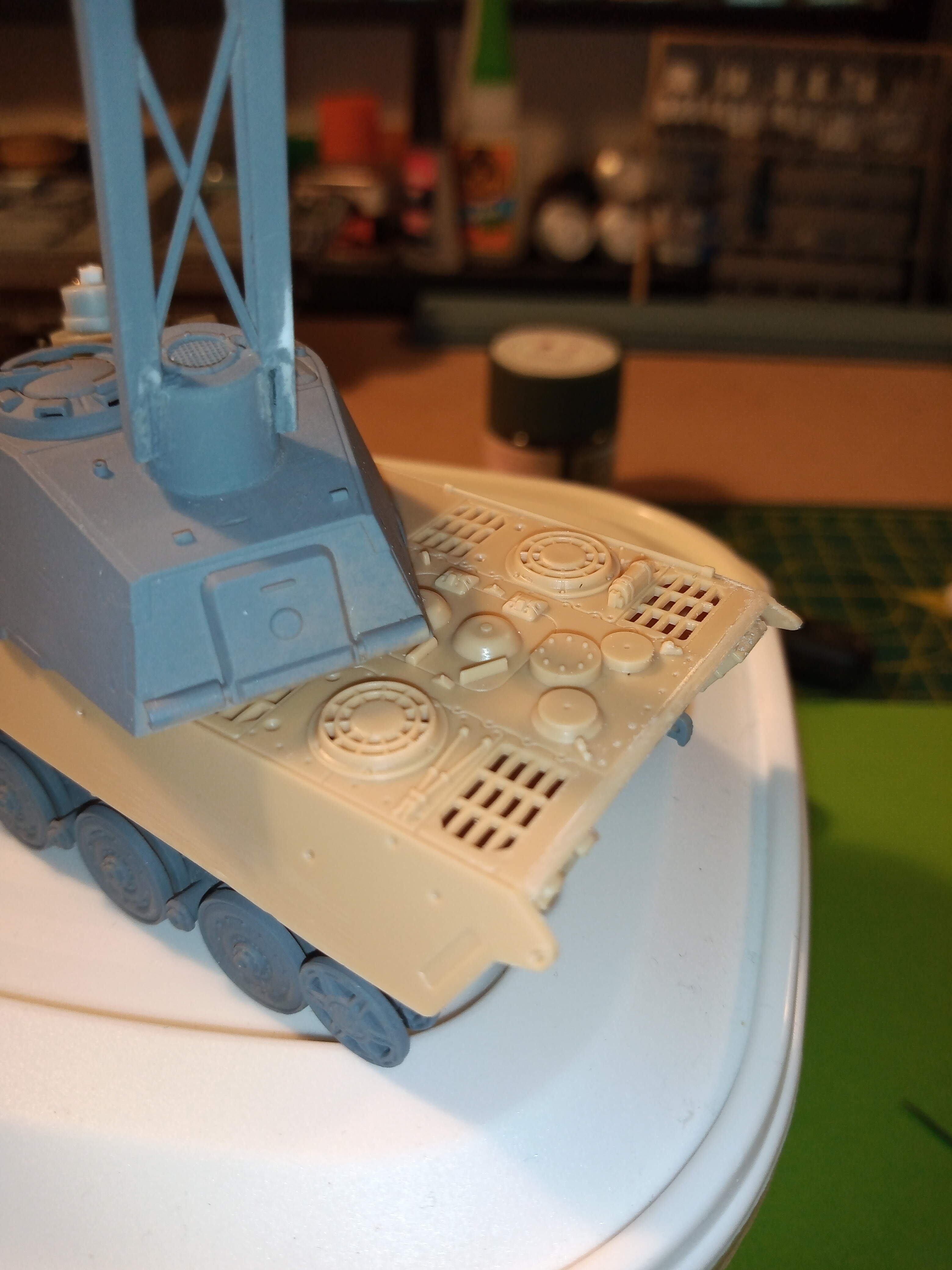 Just managed to add some stowage to the rear deck and scrim to the glacis plate camouflage net and have started to block in some colour to the upper hull…it looks a tad rough at the moment, but hopefully will blend in better as work commences,