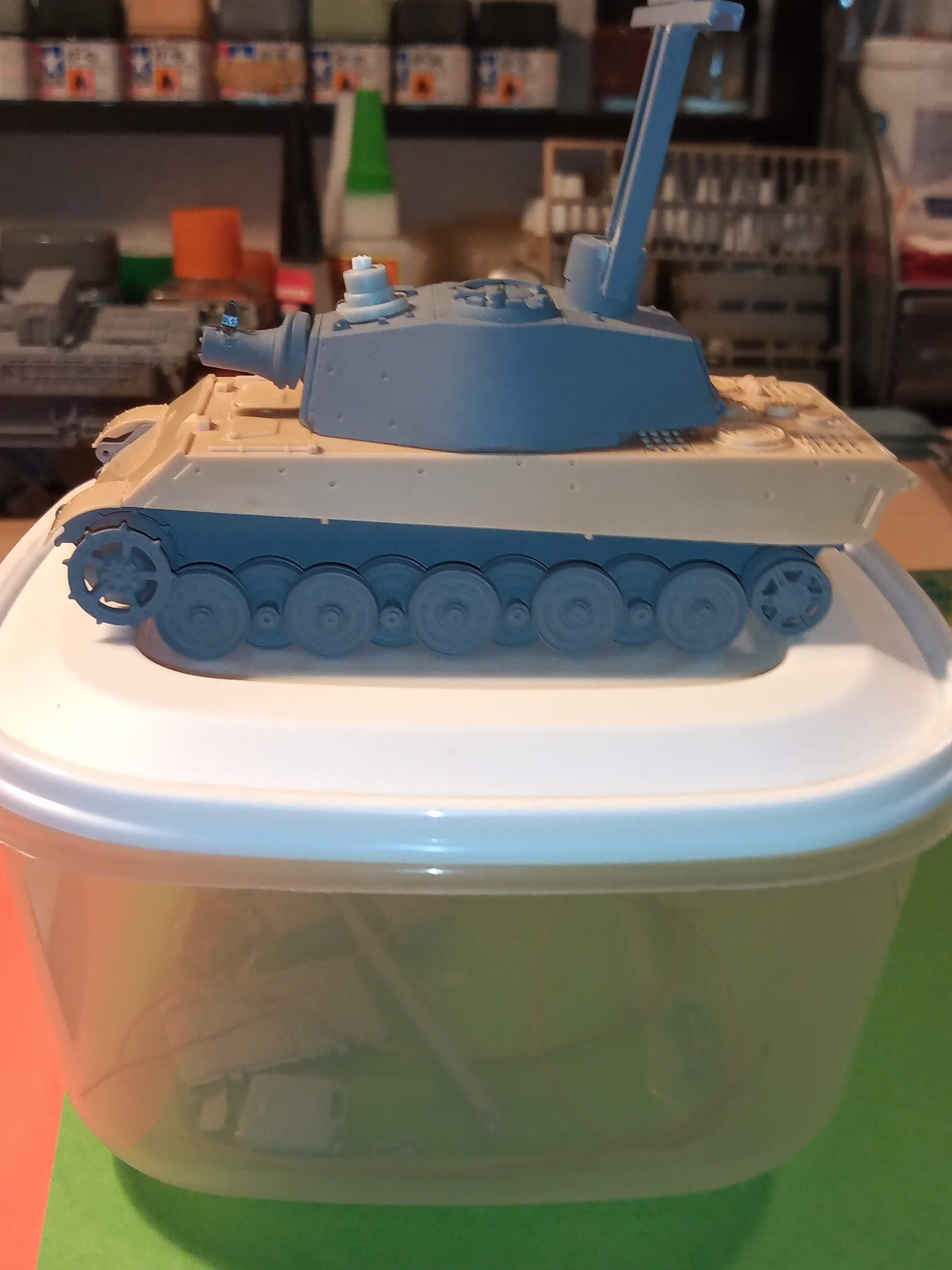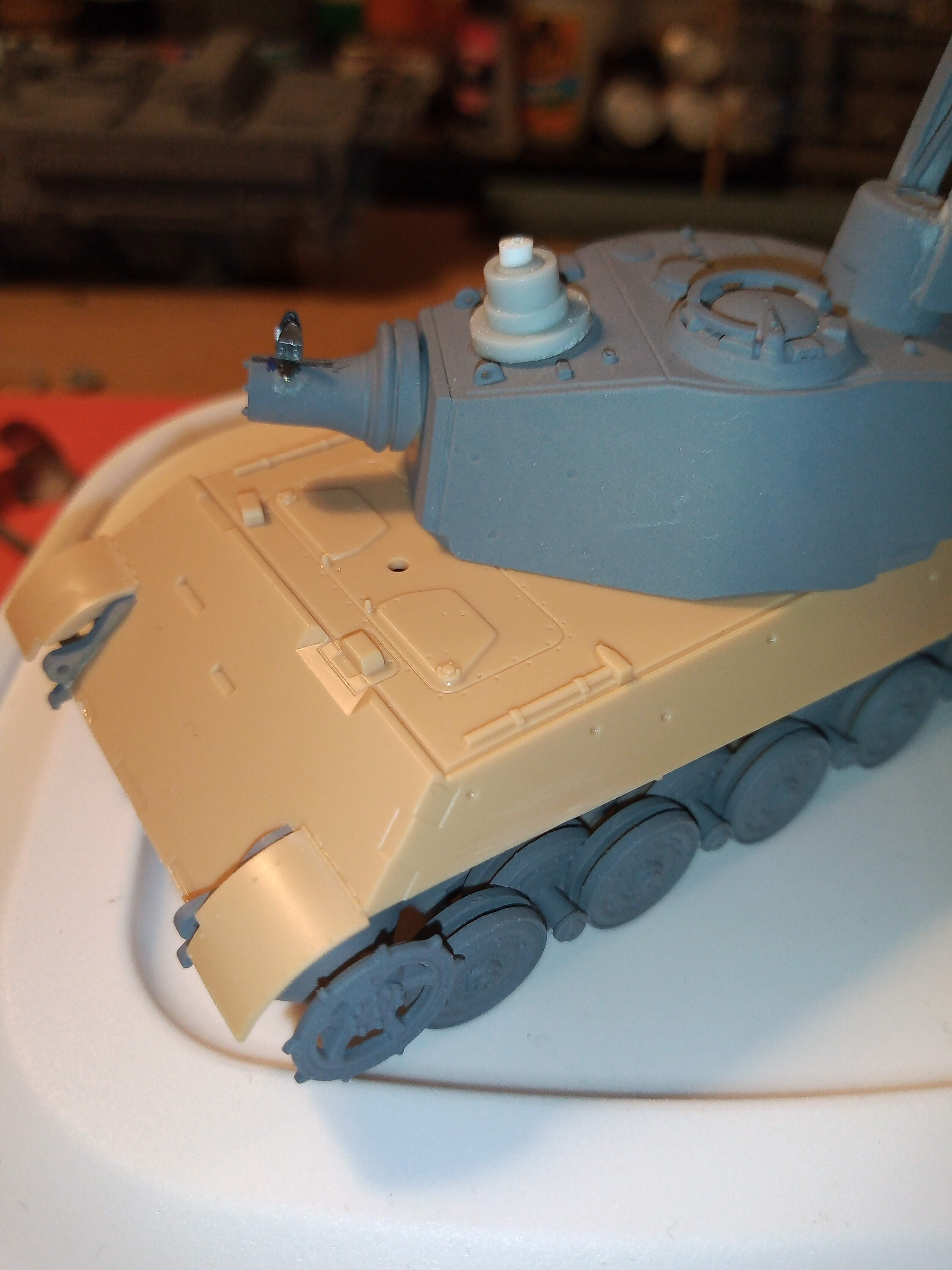 Wheel assembly sections for both sides are done and just taped on here for a test fit. Upper and lower hull is joined as well. The detail is pretty nice on this kit, mimics the 1/35 one very closely with everything looking to scale.