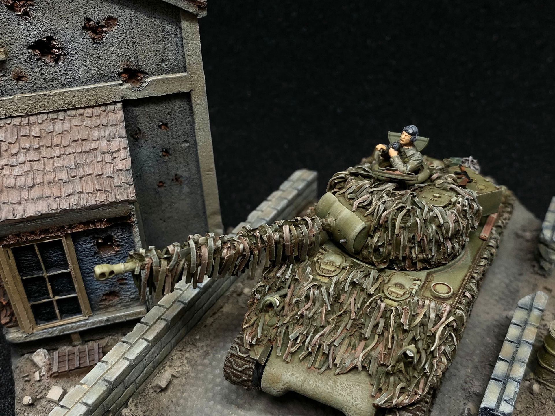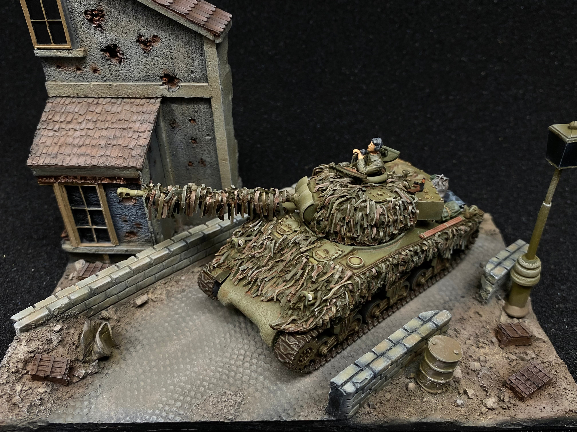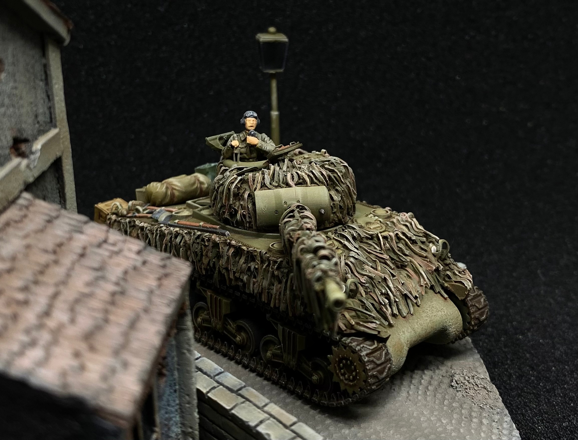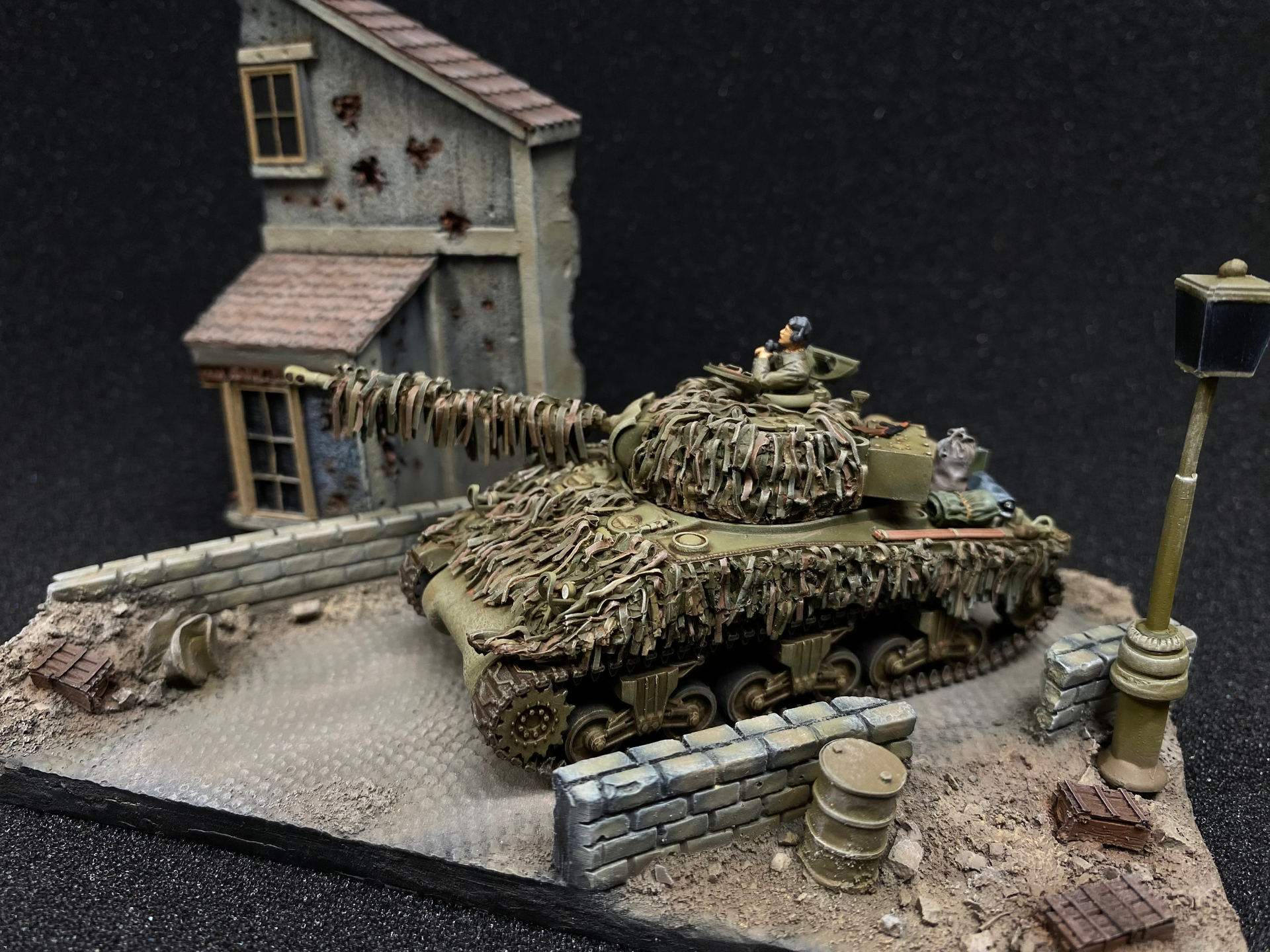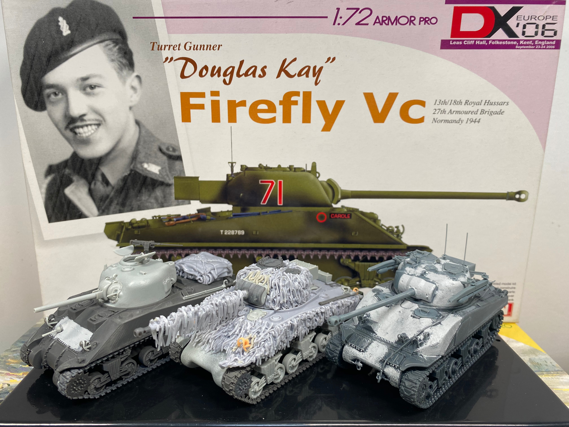 Great Fireflies.Fabric camouflage looks excellent.A good way of producing Fireflies is to use the Airfix turret for the 17 pounder turret and use a Heller kit hull.The M4 d day kit has the cast hoods to make the welded hull 1c.Another source is “Friendship models”.Ian produces resin hulls and turrets and Composite hull 1c can be made again with Heller hull.Tracks can be got from OKB Grigorov but all adds up to a costly build.Would be nice if Dragon re releases the Firefly kits or some other company making them.Id like also a nice El.Alamein M4a1 in 1.72nd .
