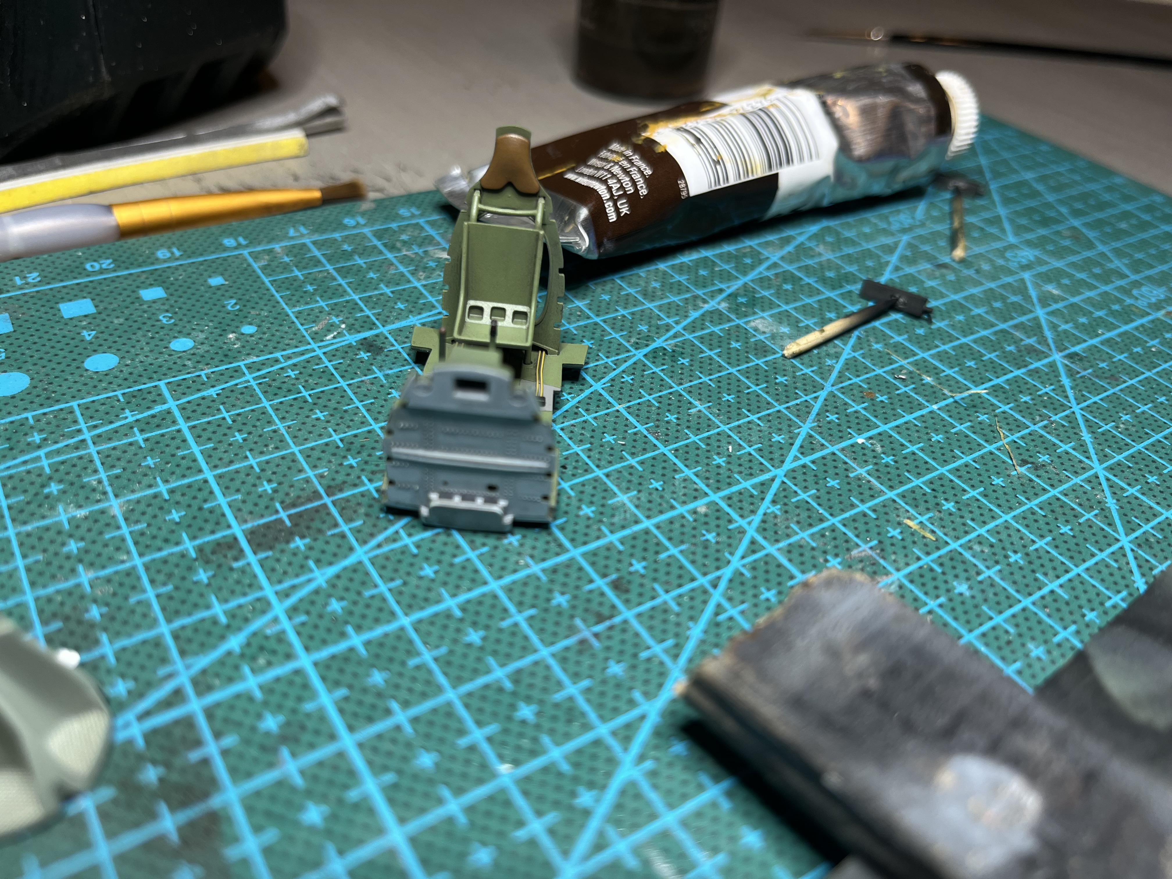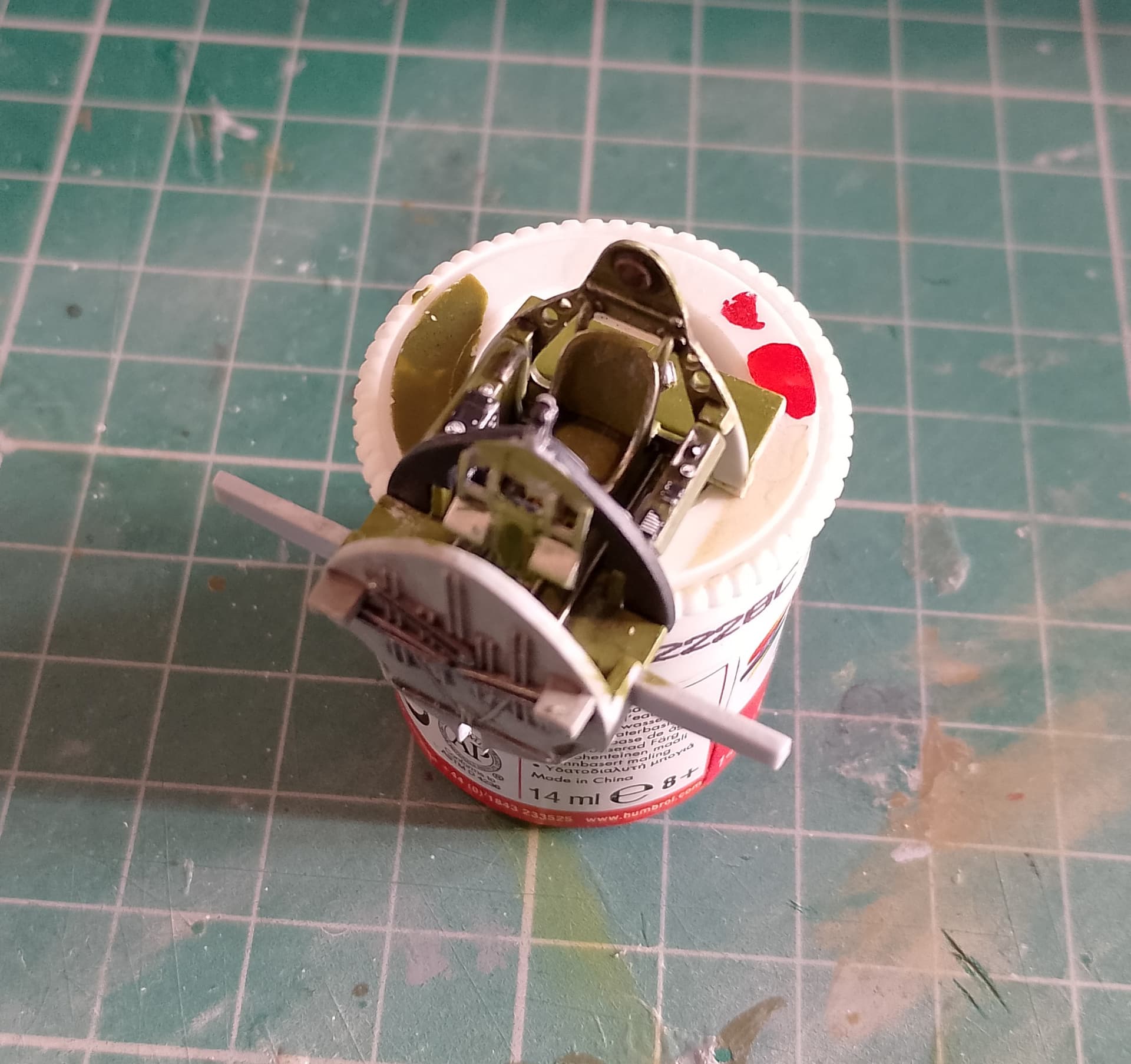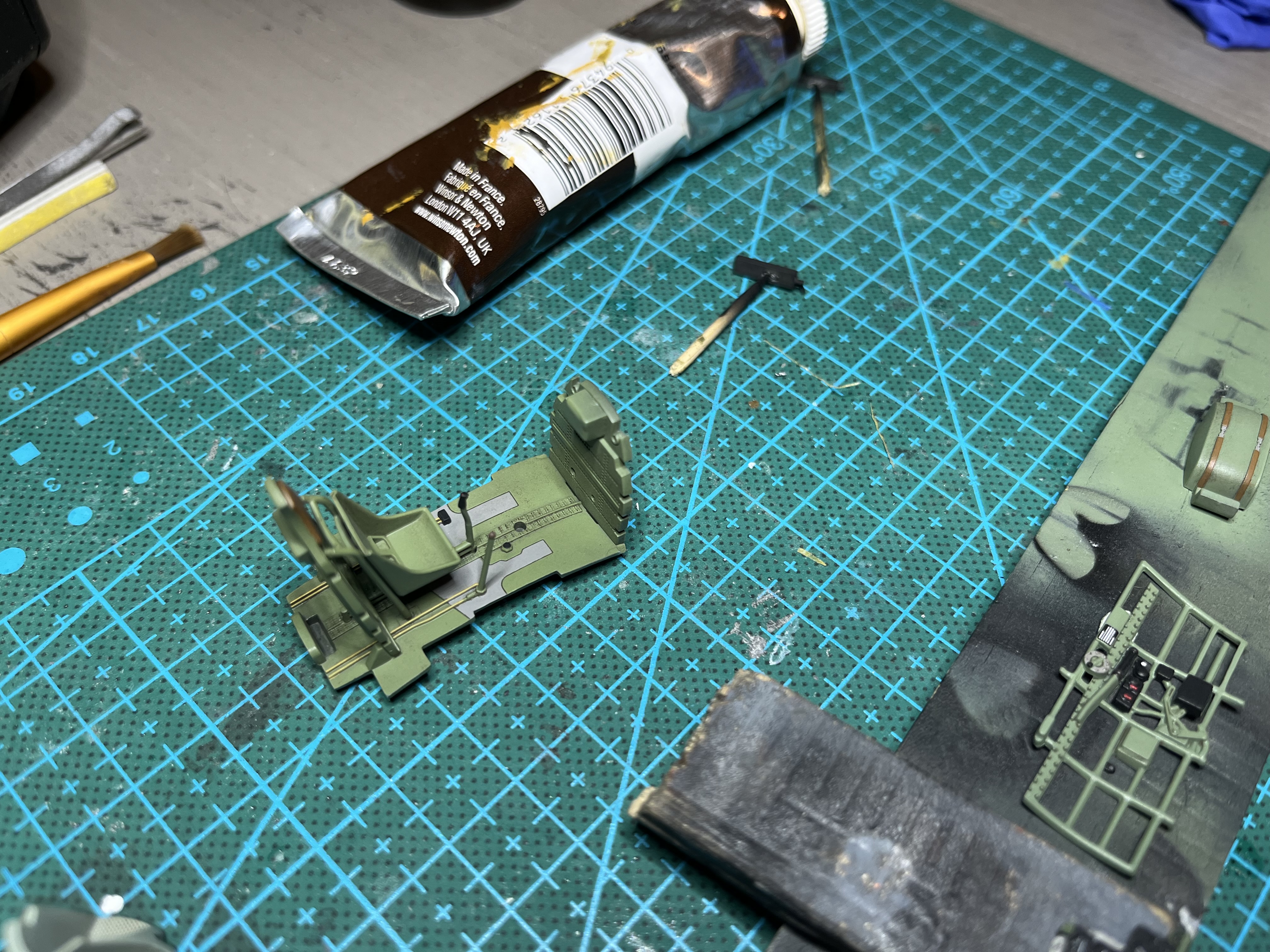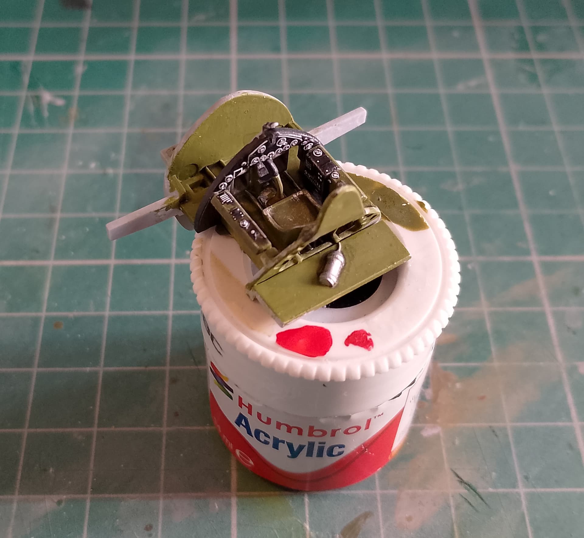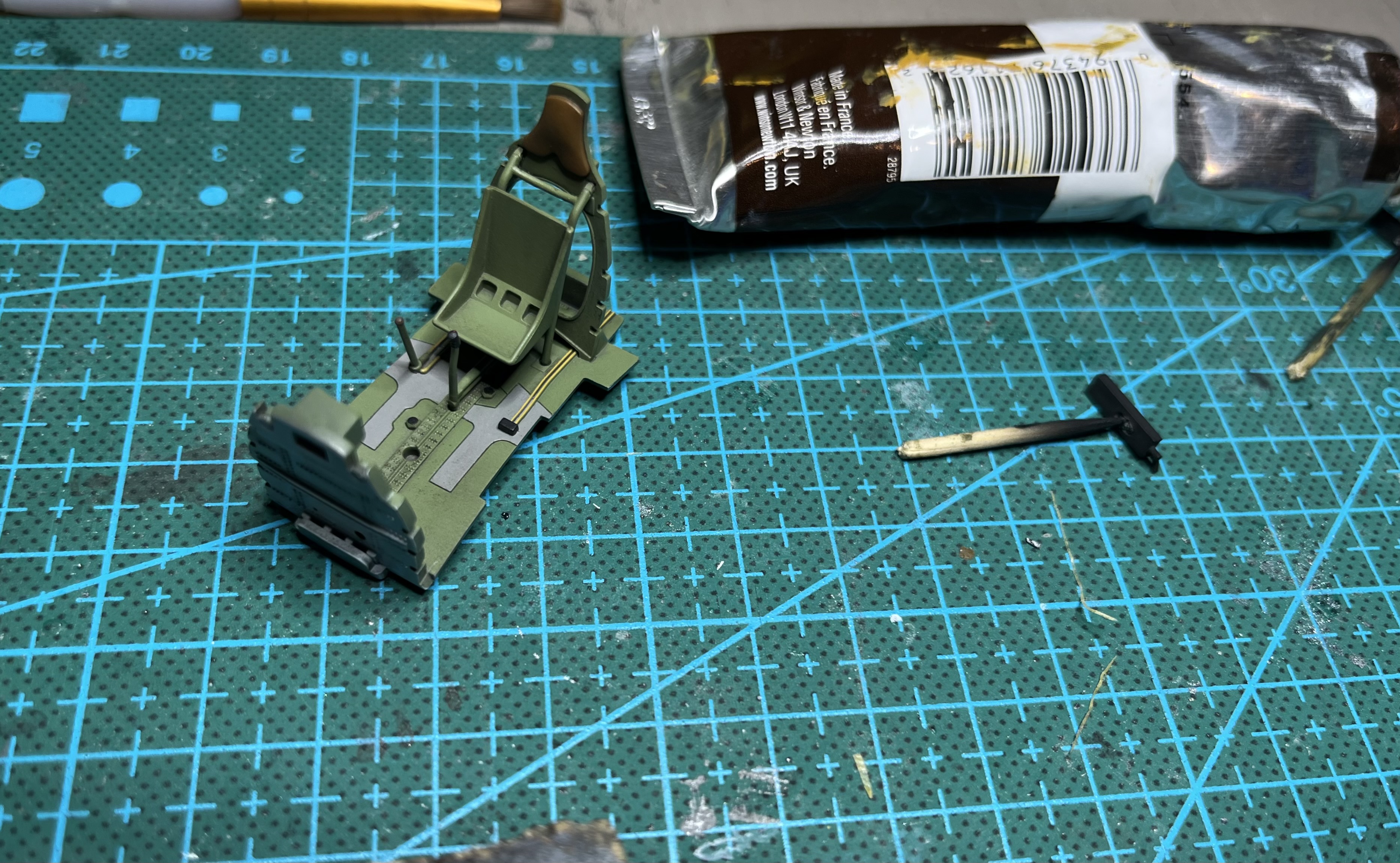 Next up is some dry brushing, pigments and light chipping as well as making a seat belt. Should be able to close the cockpit soon. Will also add some future for the dials