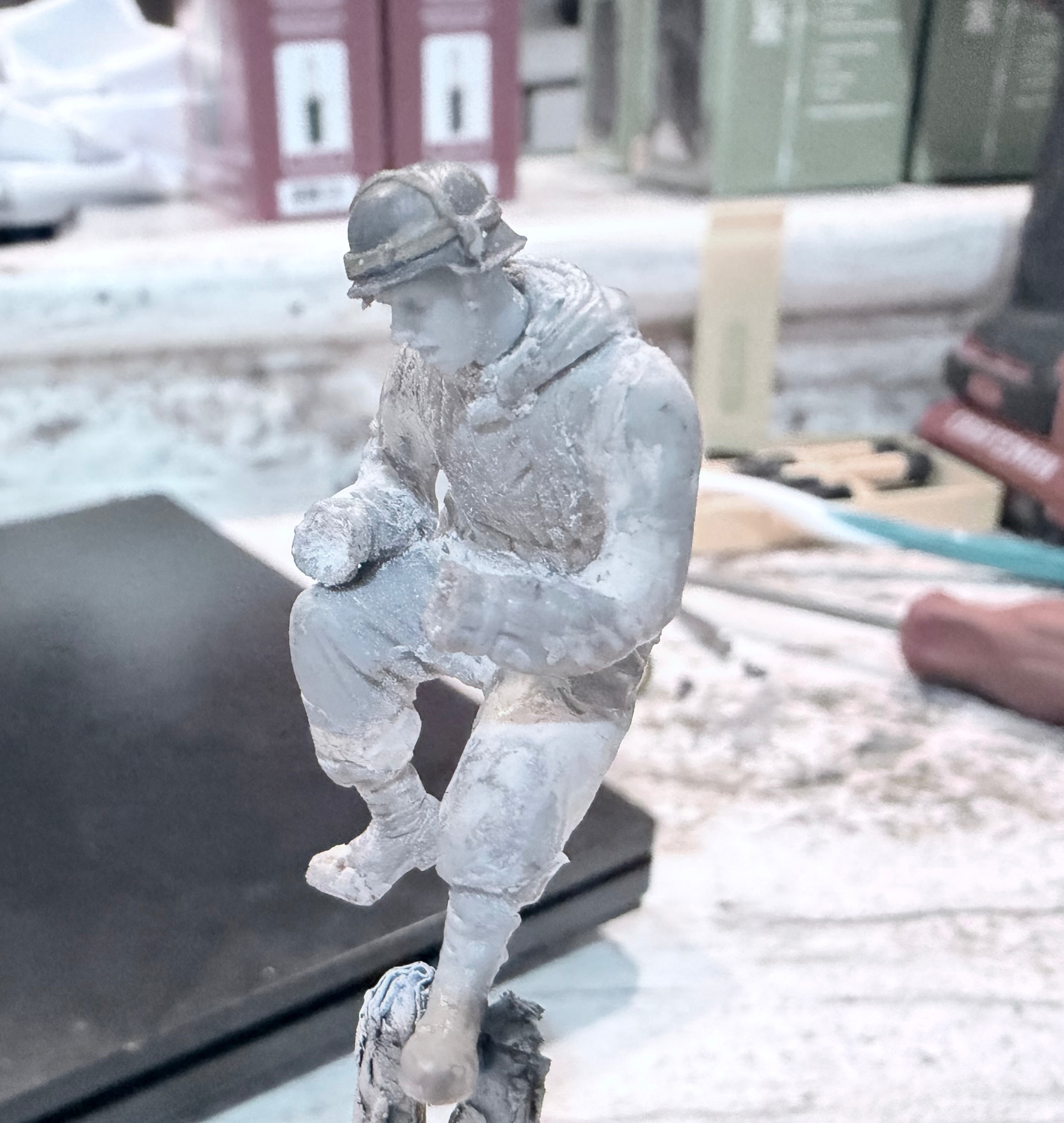 I did have a gunner sort of sitting/laying across the bench at a major angle (see previous posts), but this just, never felt right to me. It’s taken me a month to figure out a better alternative and work the putty and leg parts to both fit, and look somewhat realistic.