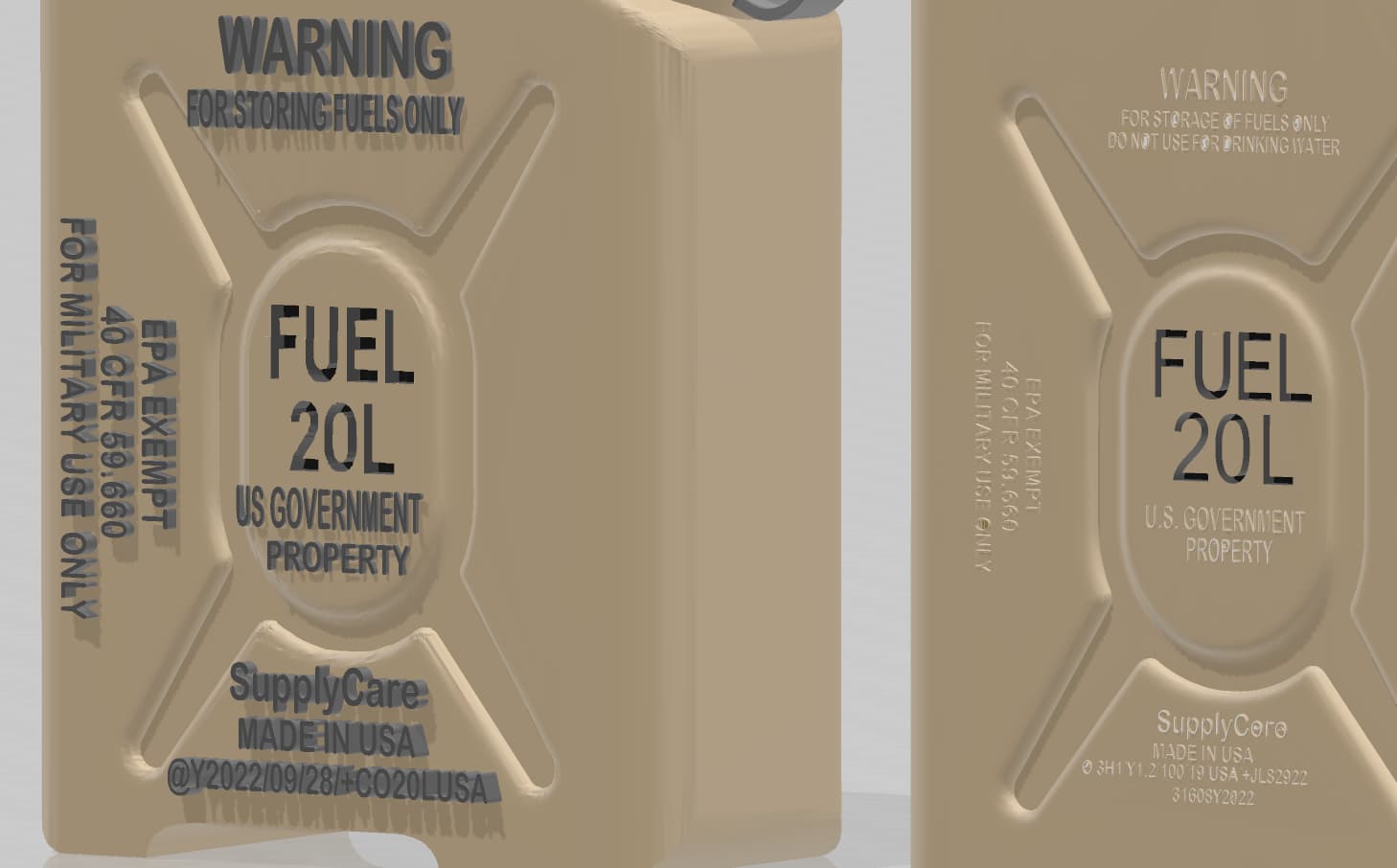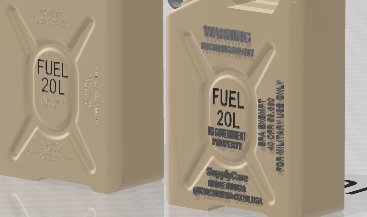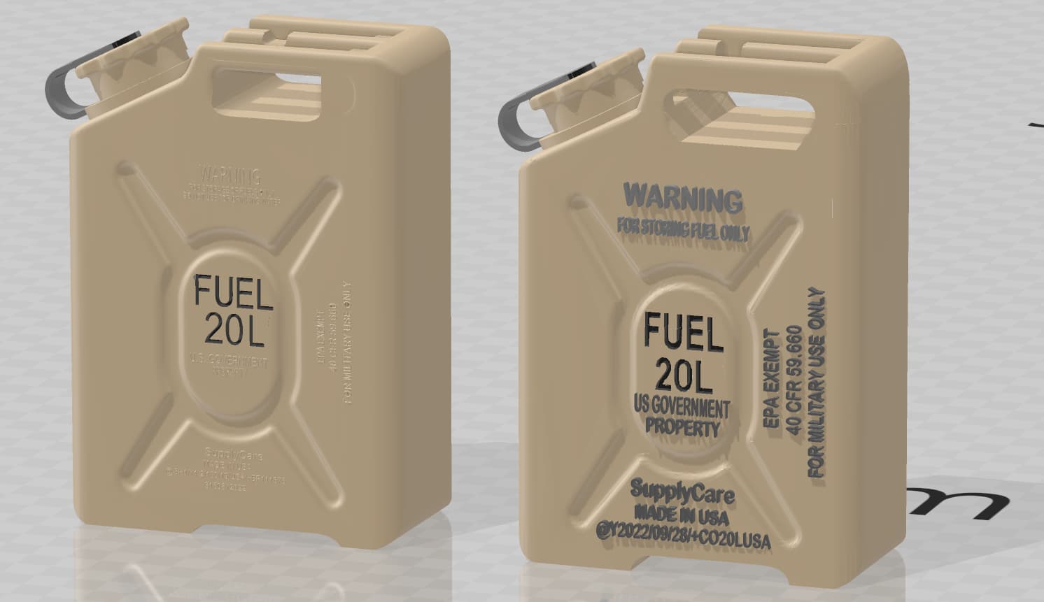 For @amoz02t , improved the design of the US modern 20L fuel can. To make the embossing visible in 1/35, I have oversized the text - not too sure how they’ll turn out, and that’s the best I can do. Indented “Fuel 20L” was bolded and its hole was deepened. In addition, I’ve improved the handle portion a bit. Hitting the 3D printer soon.