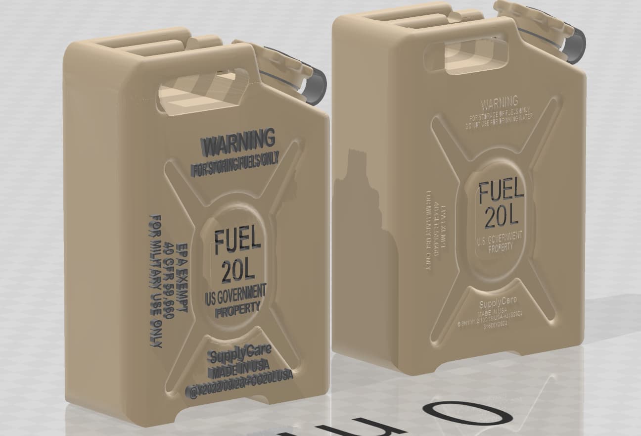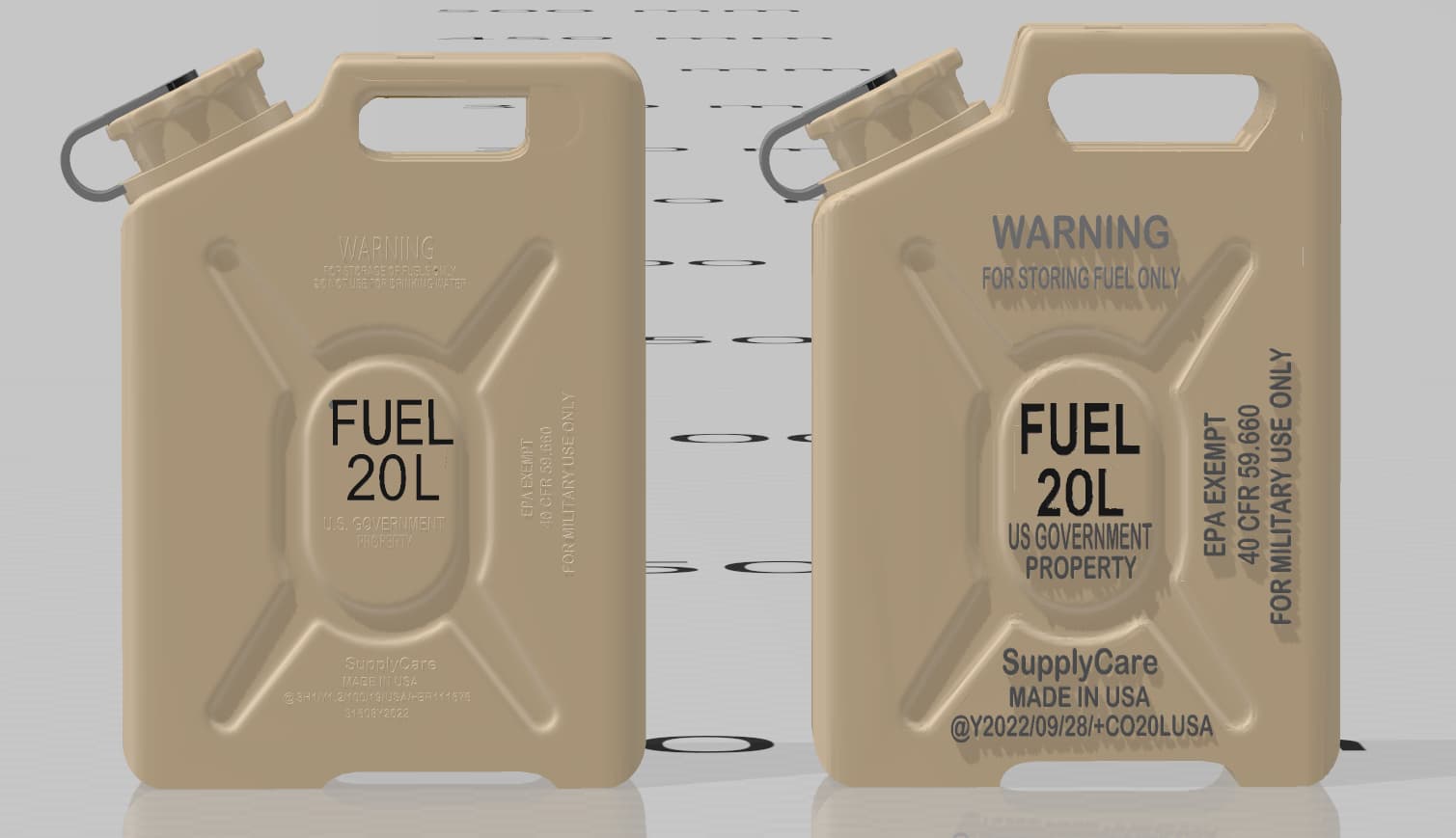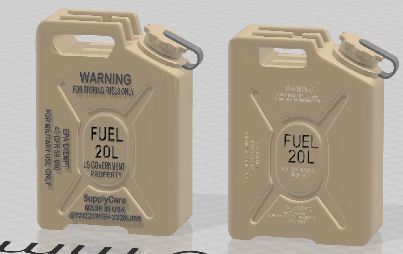 For @amoz02t , improved the design of the US modern 20L fuel can. To make the embossing visible in 1/35, I have oversized the text - not too sure how they’ll turn out, and that’s the best I can do. Indented “Fuel 20L” was bolded and its hole was deepened. In addition, I’ve improved the handle portion a bit. Hitting the 3D printer soon.