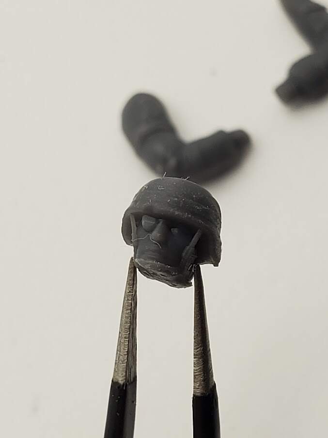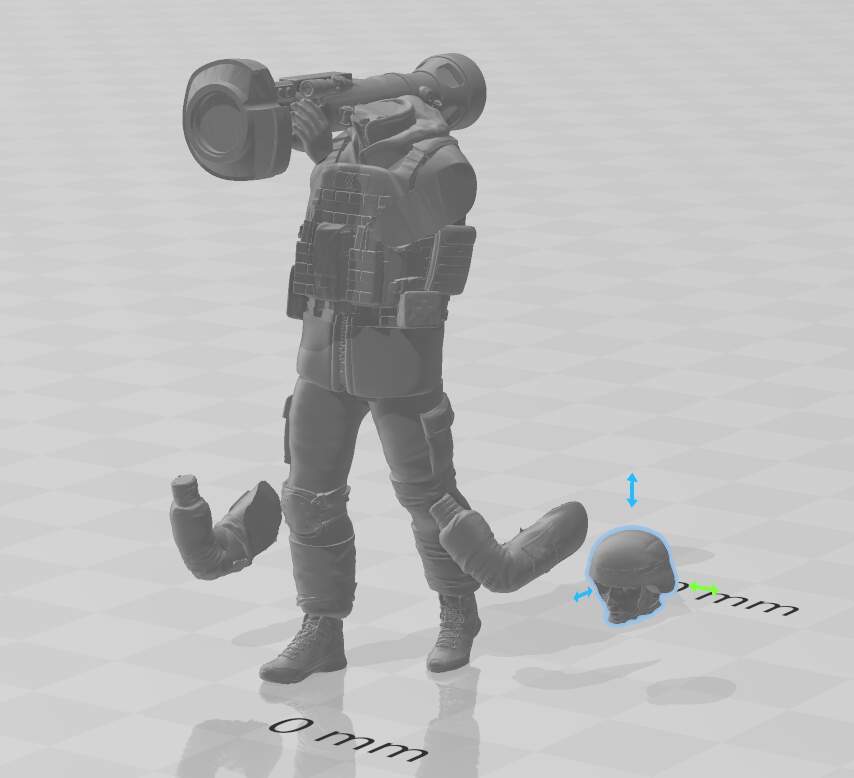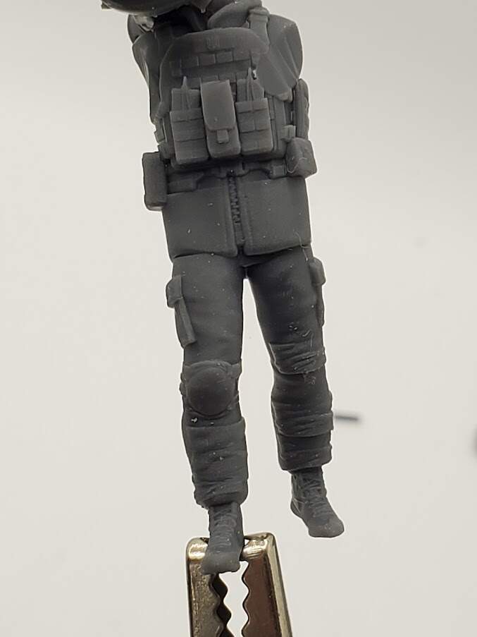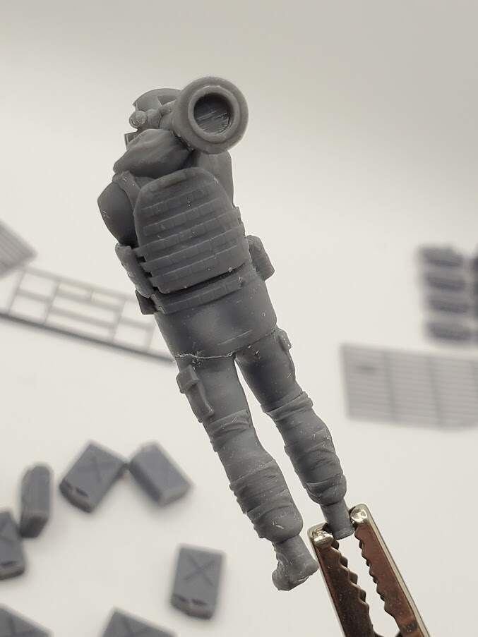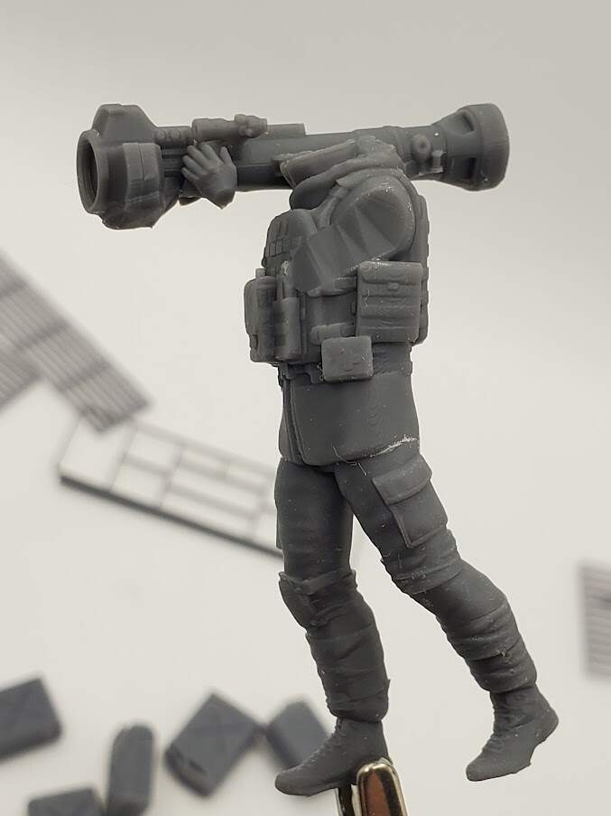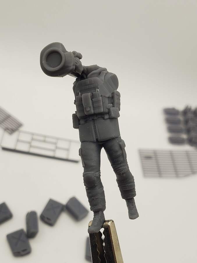 thickened his legs (no more skinny jeans look it had before), added more folds to his trousers, separated his head and arms for easier painting, and adjusted the size of NLAW (it was oversized in the original CAD from the designer)
