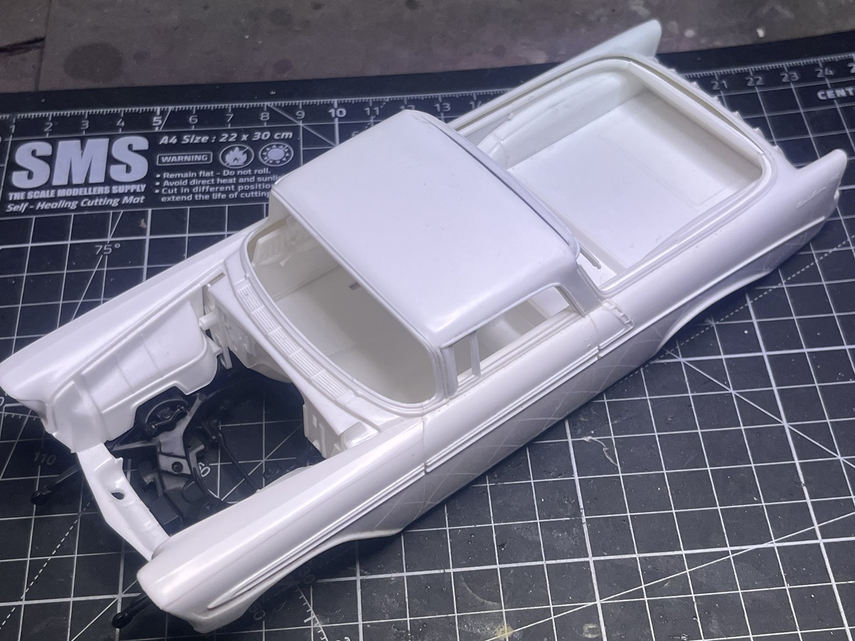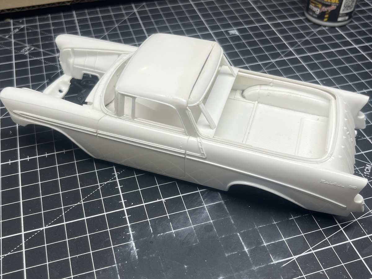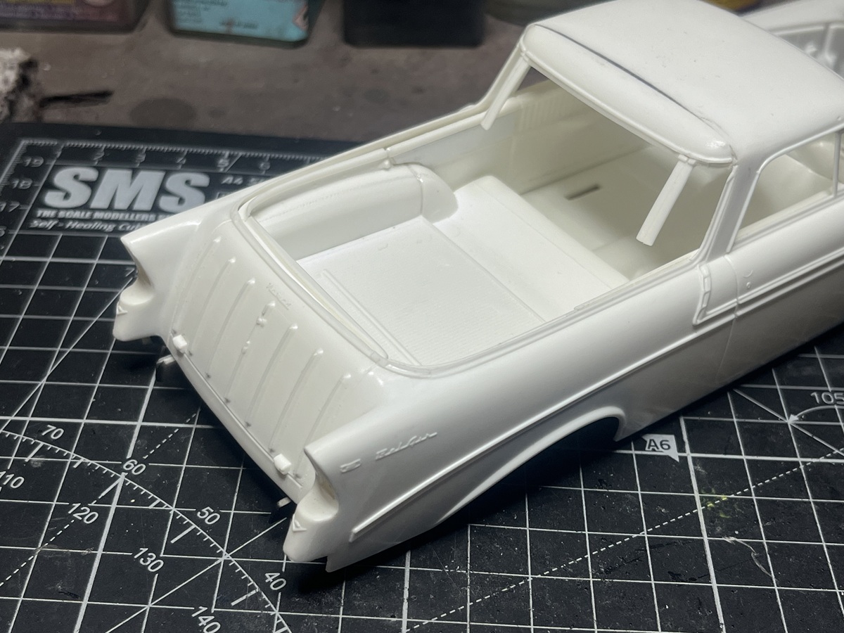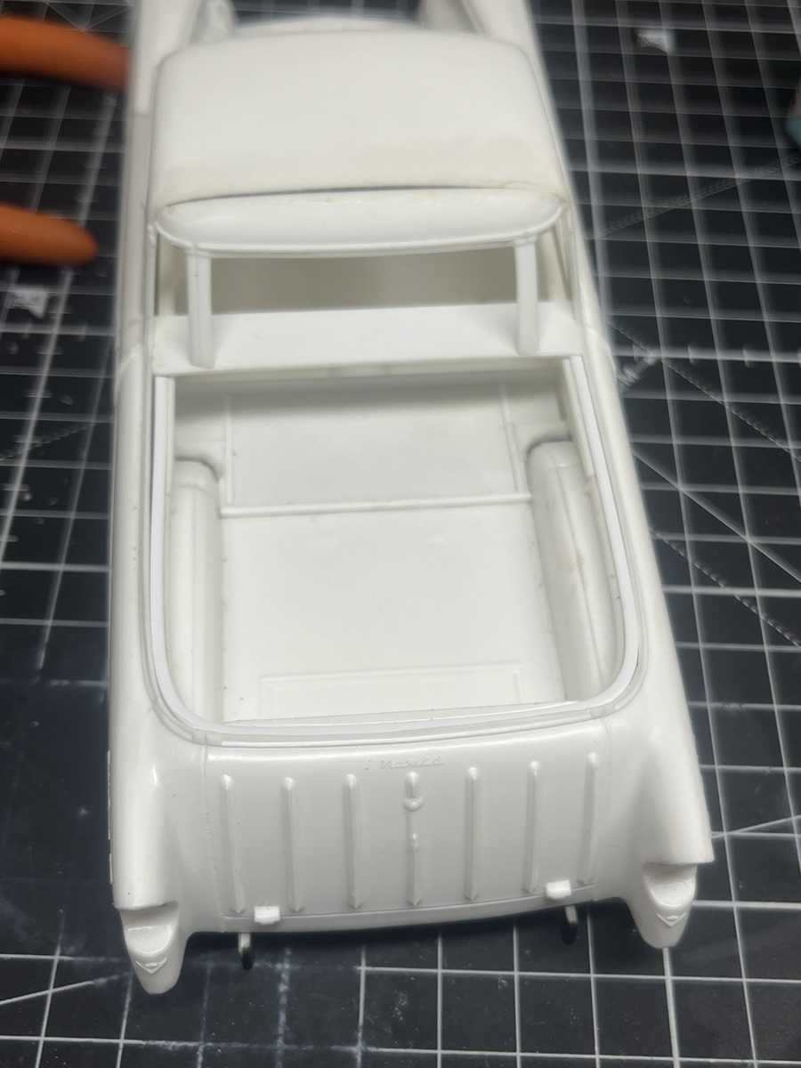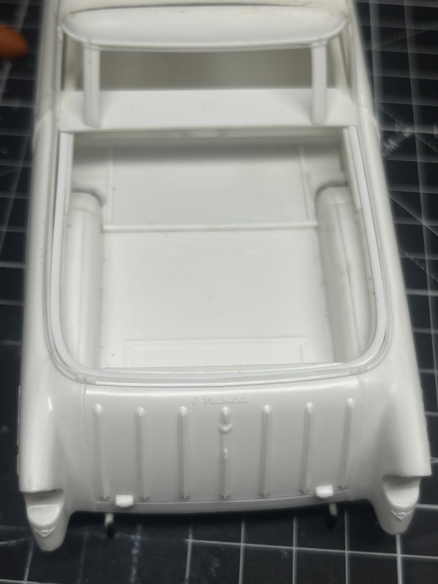 I hit a roadblock looking at the gap between the tub and rear body sides and shelved it. This gap is filled by the clear glass part in the Nomad build. Last night I dragged it out while waiting for cement and paint to dry on the Corvettes and after turning it over for a few minutes I decided to bite the bullet and cemented in some 1.5mm square Evergreen strip. Plenty of cement, slowly bent it around the curves of the tailgate, and securely clamped overnight.