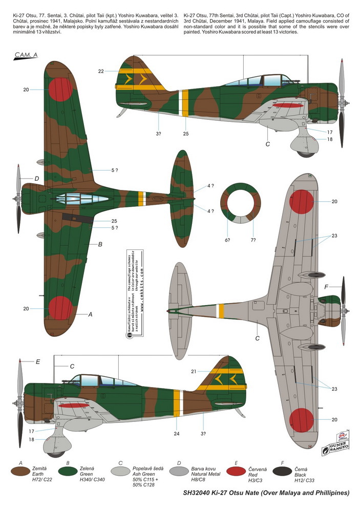 Ki-27 Otsu, 77th Sentai, Malaysia, 1941. Colors? Some references show IJA #1 grey green underside, #21 Midori iro green, #31 Cha-Kasshoku tea color. Some reference the afore mentioned with another green (IJA #27?) . A third scheme shows #1/#21/#31/ #3 grey indigo