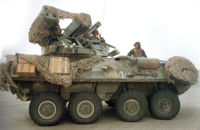 LAV-AD used a 25mm gatling gun and two 4-shot Stinger pods. Targeting was optical passive with FLIR and TV camera sights and the human eyeballs…no radar at the time although the LAV-AD “Blazer” turret had a rotating radar that the USMC didn’t opt for. The LAV-AD turret windows were armored.