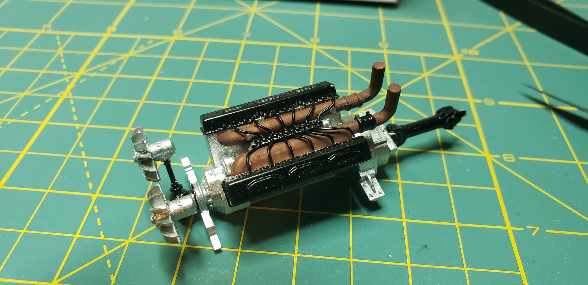 The engine was sprayed silver w black valve covers, the exhaust manifolds were painted w a rusty brown base since this will be hidden under the hood .I just wanted some random color