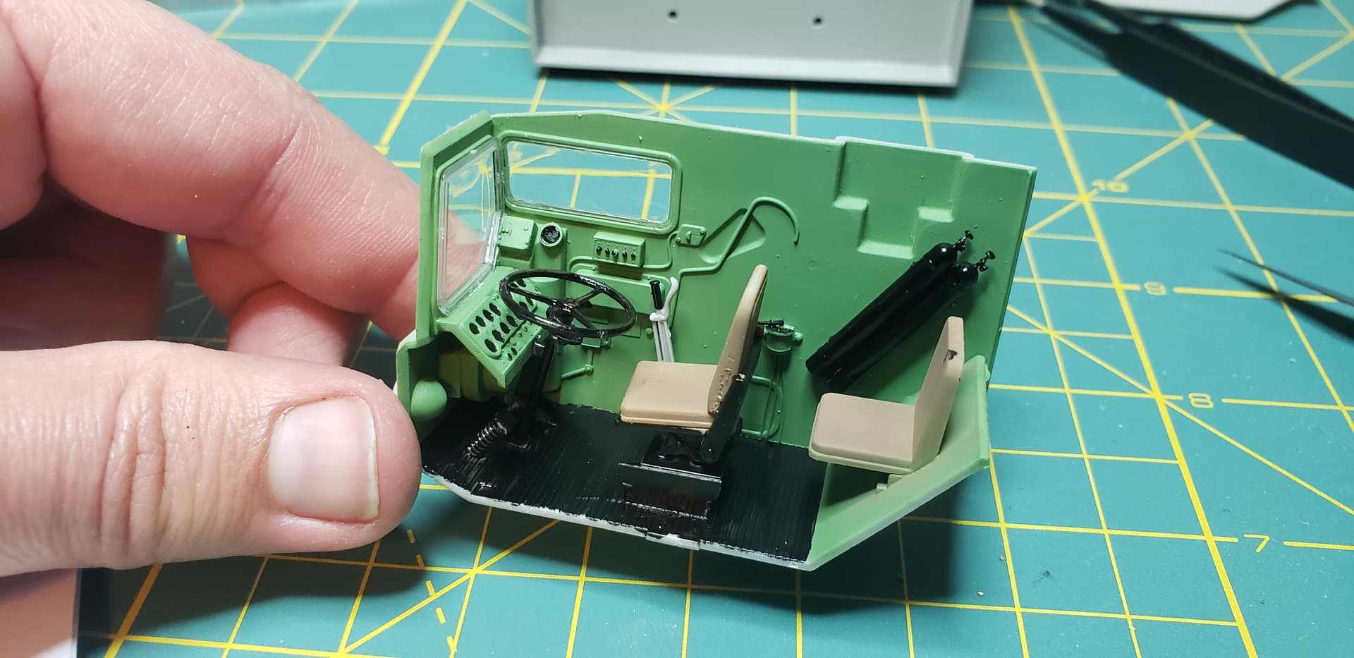 I assembled the cab, scrounged around the paint rack for a suitable green for the interior, then got busy making fumes . I ended up using testors pale green w a few drops of white to lighten it a touch.