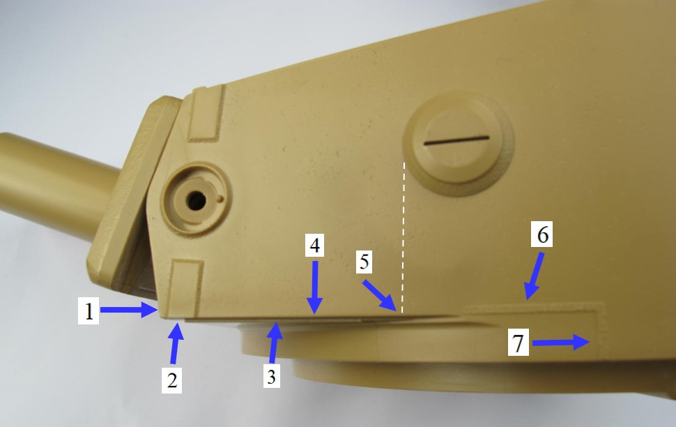 7. The vertical weld seams. See VIM Pic 007 and TAM Pic 01. Here also we see that the TAM kit shows only 1 weld seam while the VIM Tiger shows 2 vertical weld seams. The verdict for the current seam on the TAM kit is the same as above: sand away and replace by two new (correct) seams following VIM Pic 007.