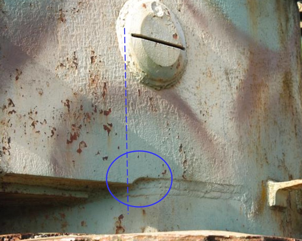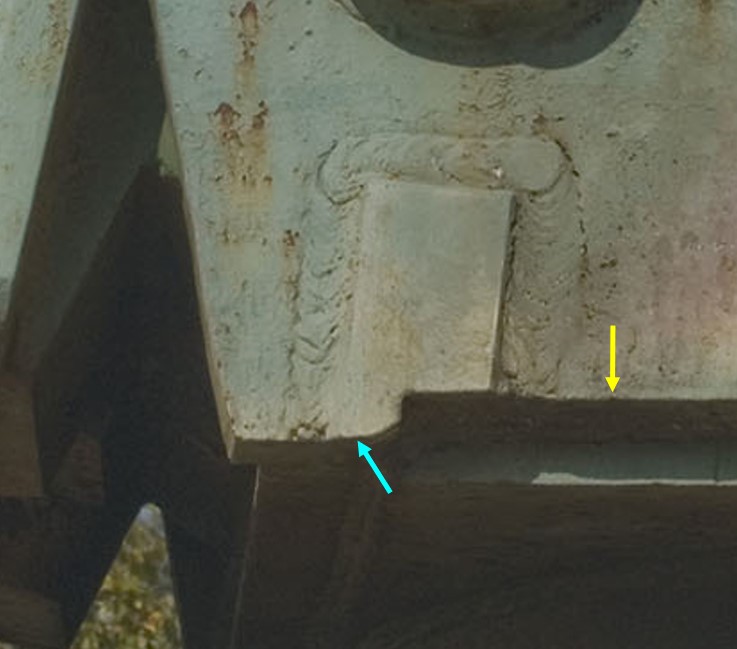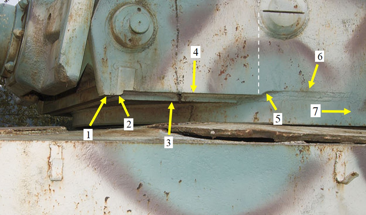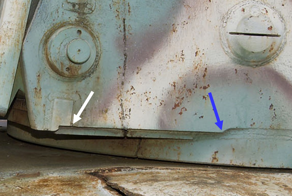 Almost vertically under the front side of the Turret Vision Port Plugs, (see blue line in above picture) the Cheek Reference Line shows at it’s right end, a clearly visible scallop (blue circle) that goes smoothly upwards. It gives access to the weld seams that come from the Floor Plate’s aft edge and form the connection between the Lower Turret Mantle and the Cheek.
