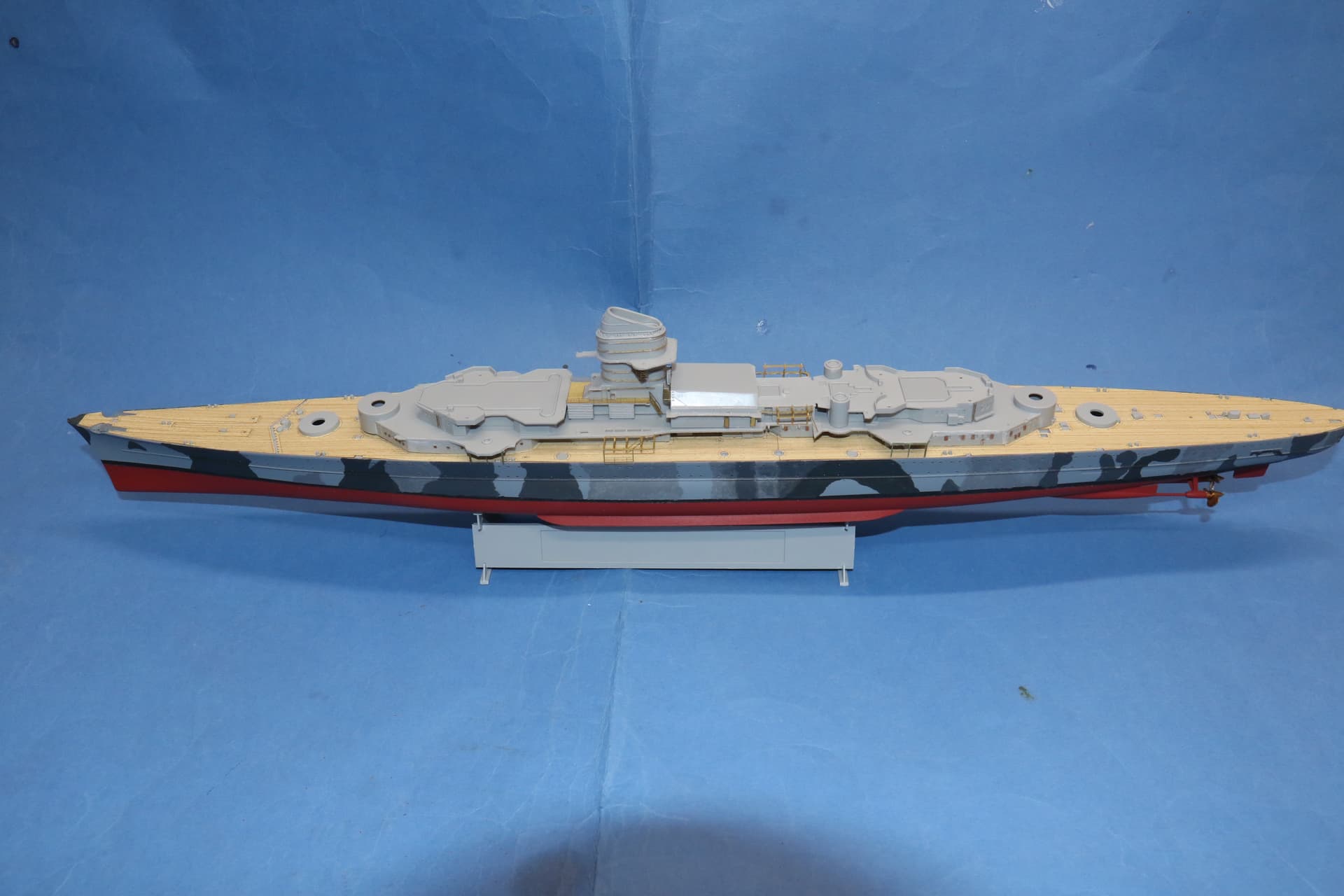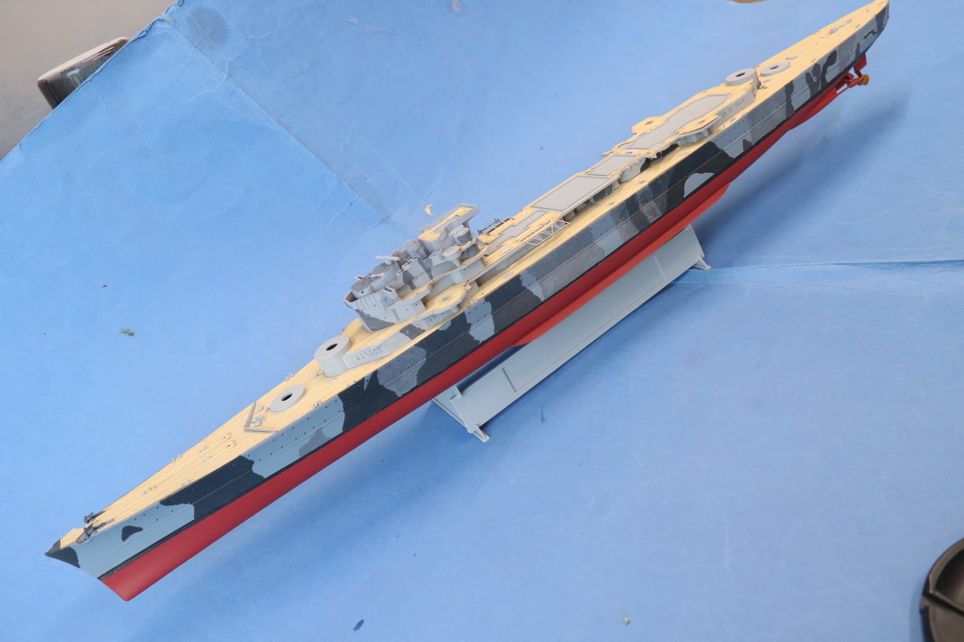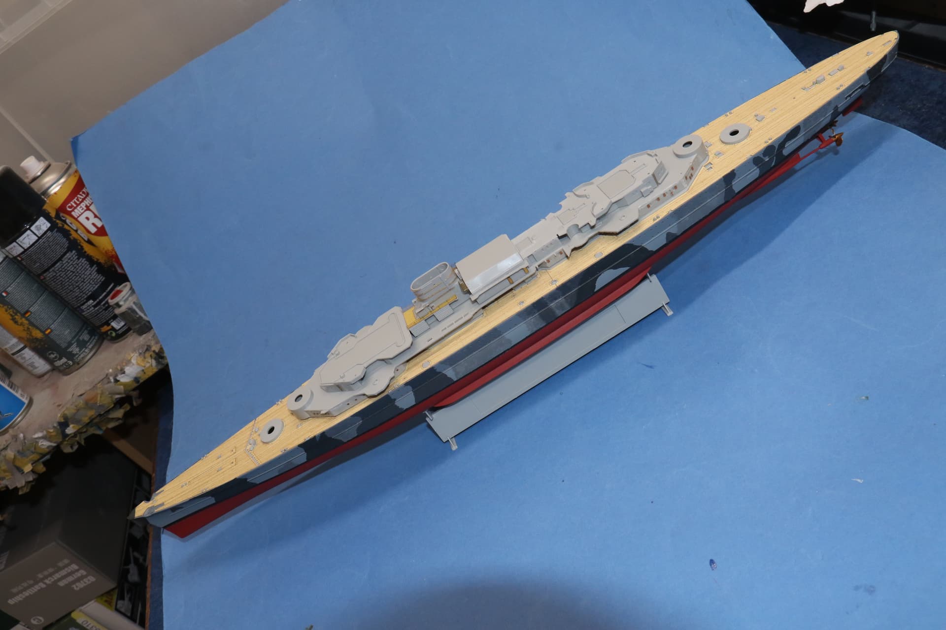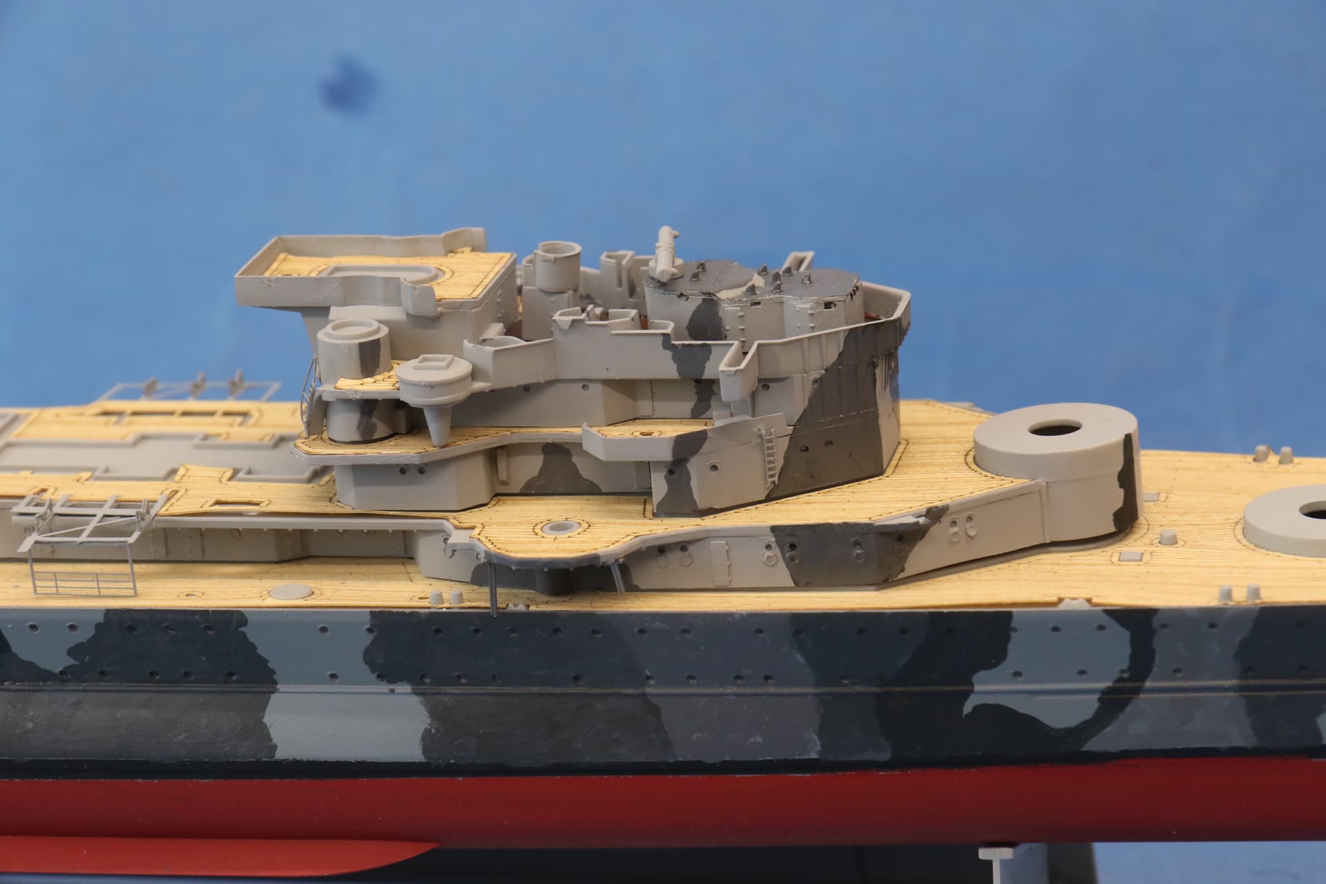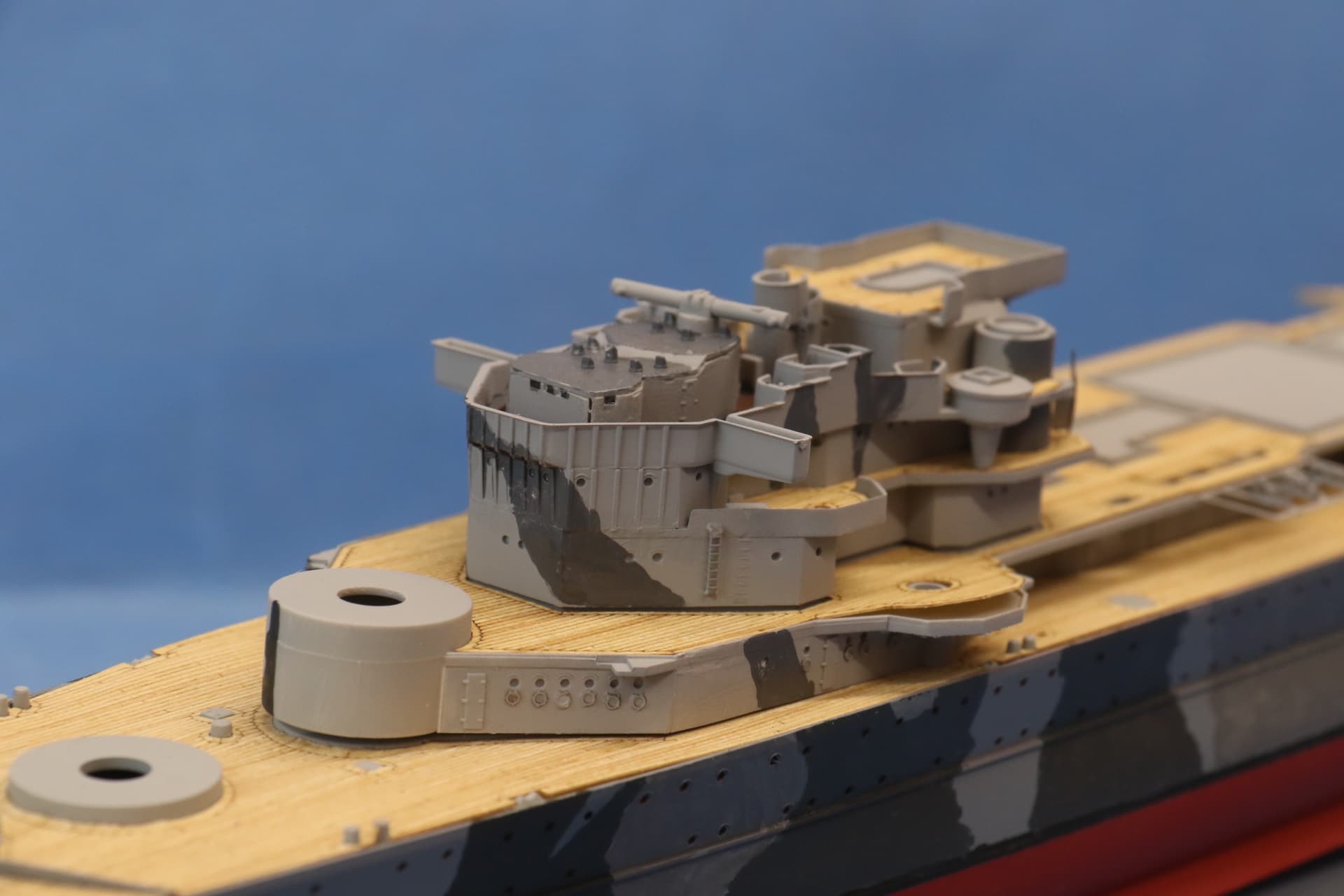 The superstructure deck camo done along with the bridge finally fixed down. A touch of Cyno has been used to secure Bruno barbette down properly.