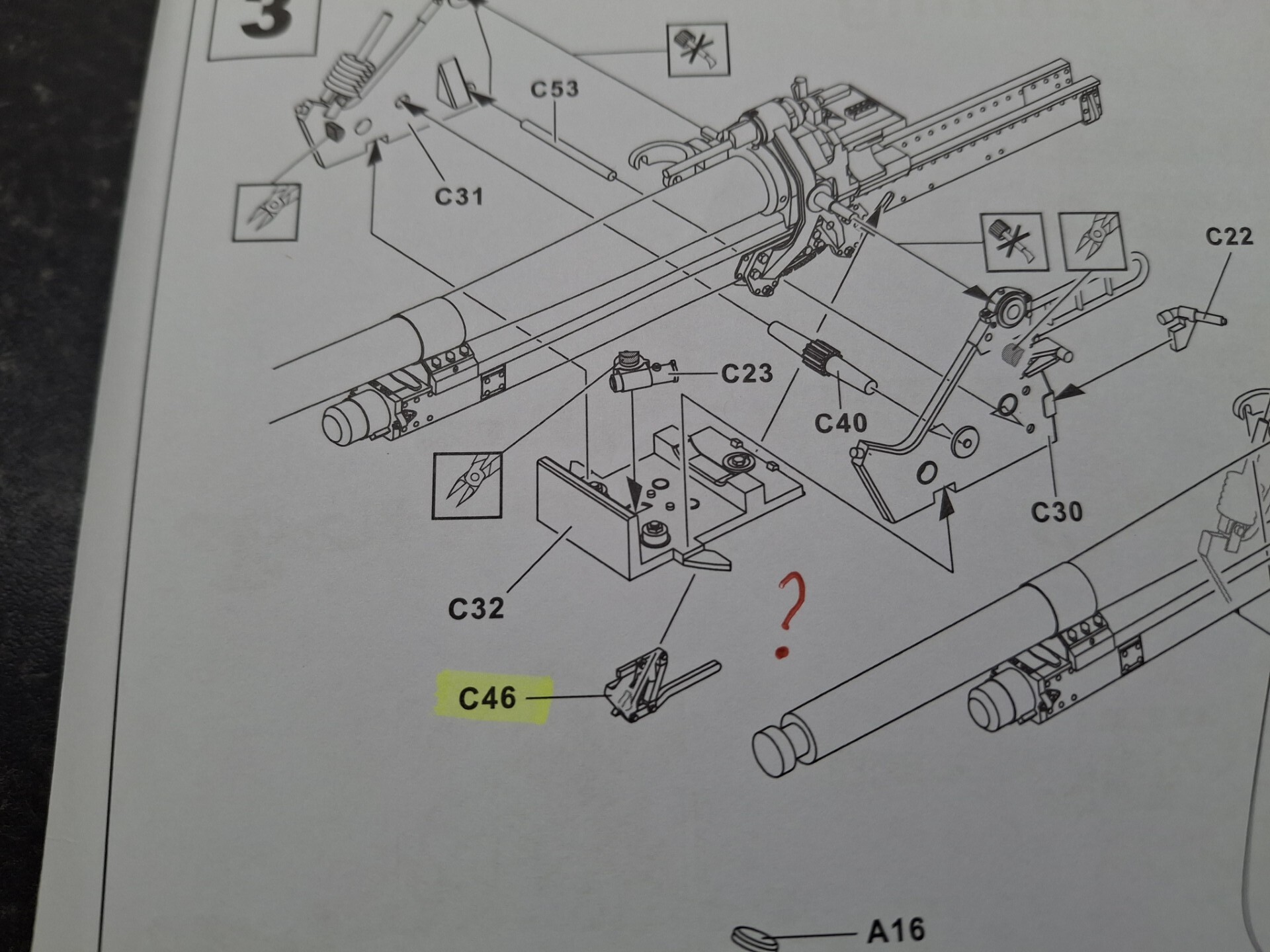 I’ve been trying to assemble this kit for the Veteran’s Tribute campaign but have run into an assembly hitch: I cannot work out how part C46 is positioned/glued: