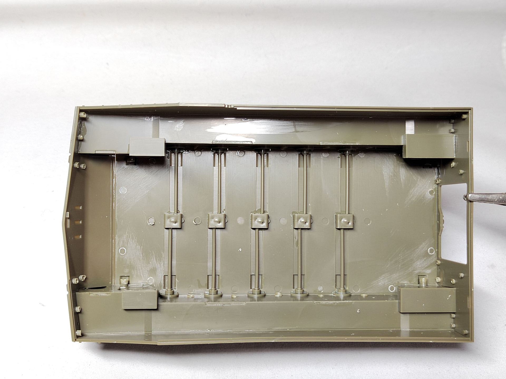 AFV Club re-used a number of sprues from former M109 references which I understand to cut production costs. However the “old” parts were not always well designed to adapt the Doher specific parts. Most of the time you just have drawings of the parts in place but no positioning marks or holes. The most annoying issue is the lack of holes to install the rails on the sides of the hull. You are supposed to drill them out. According to the instructions there are marks molded on the inner side of the hull sides. The actual parts do not have the marks so it’s a guess game to know where to drill them. I ended by removing the positioning rods and “guesstimating” the positions of the various accessories with the help of Desert Eagle book.
