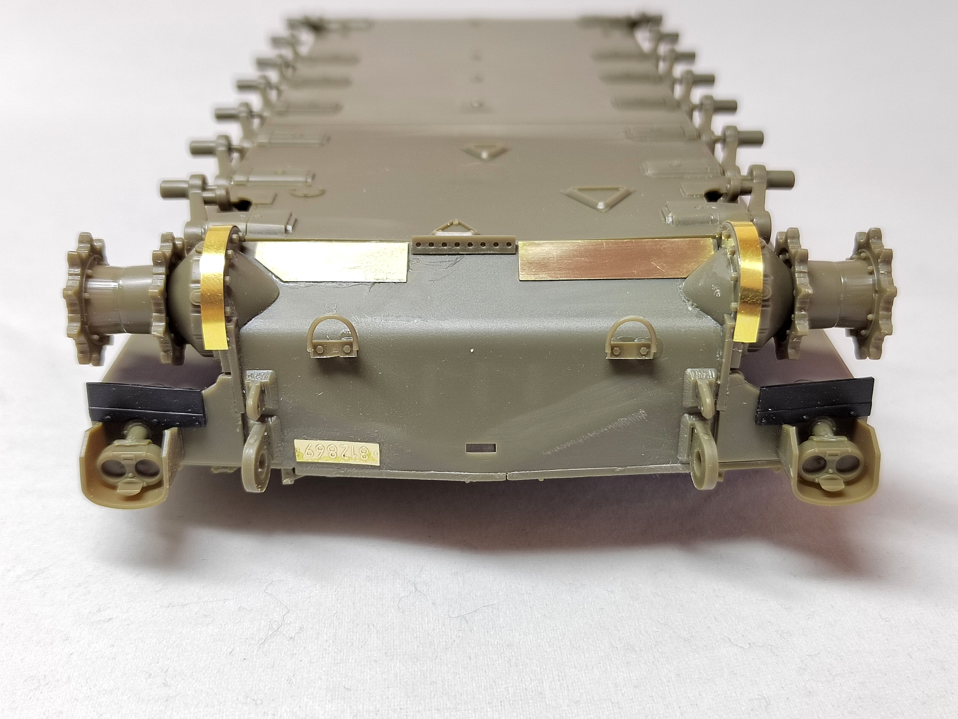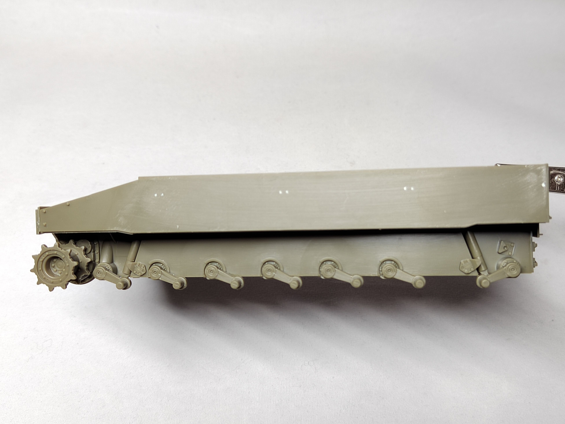 The tracks are shortened by 2 links. They’ll need to be glued on top of the roadwheels.