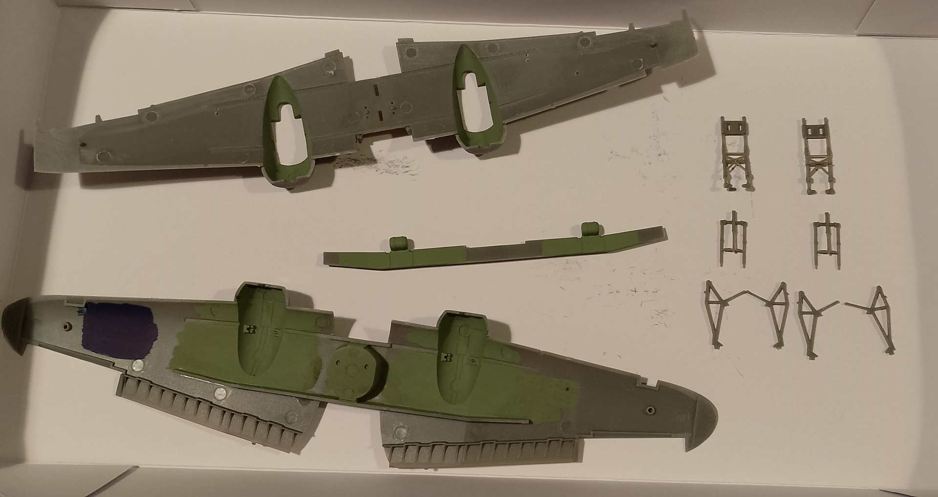 Got the undercarriage parts cleaned up and painted the wheel wells. Used Tamiya Japanese interior green which is a very good match for RAF. Tamiya isn’t my usual poison, but when thinned it does go down thinner than Humbrol. Just have to minimise the brush strokes to keep it smooth. Some of the fit problems with this kit might stem from the tight fit of interiors on some of the new Airfix, so I want to minimise those problems where possible. I tried thinning some Humbrol interior green (a brand new gen3 bottle) with Vallejo thinner, but found it pooled into little puddles and didn’t adhere well. Will have to experiment to find what works best.
