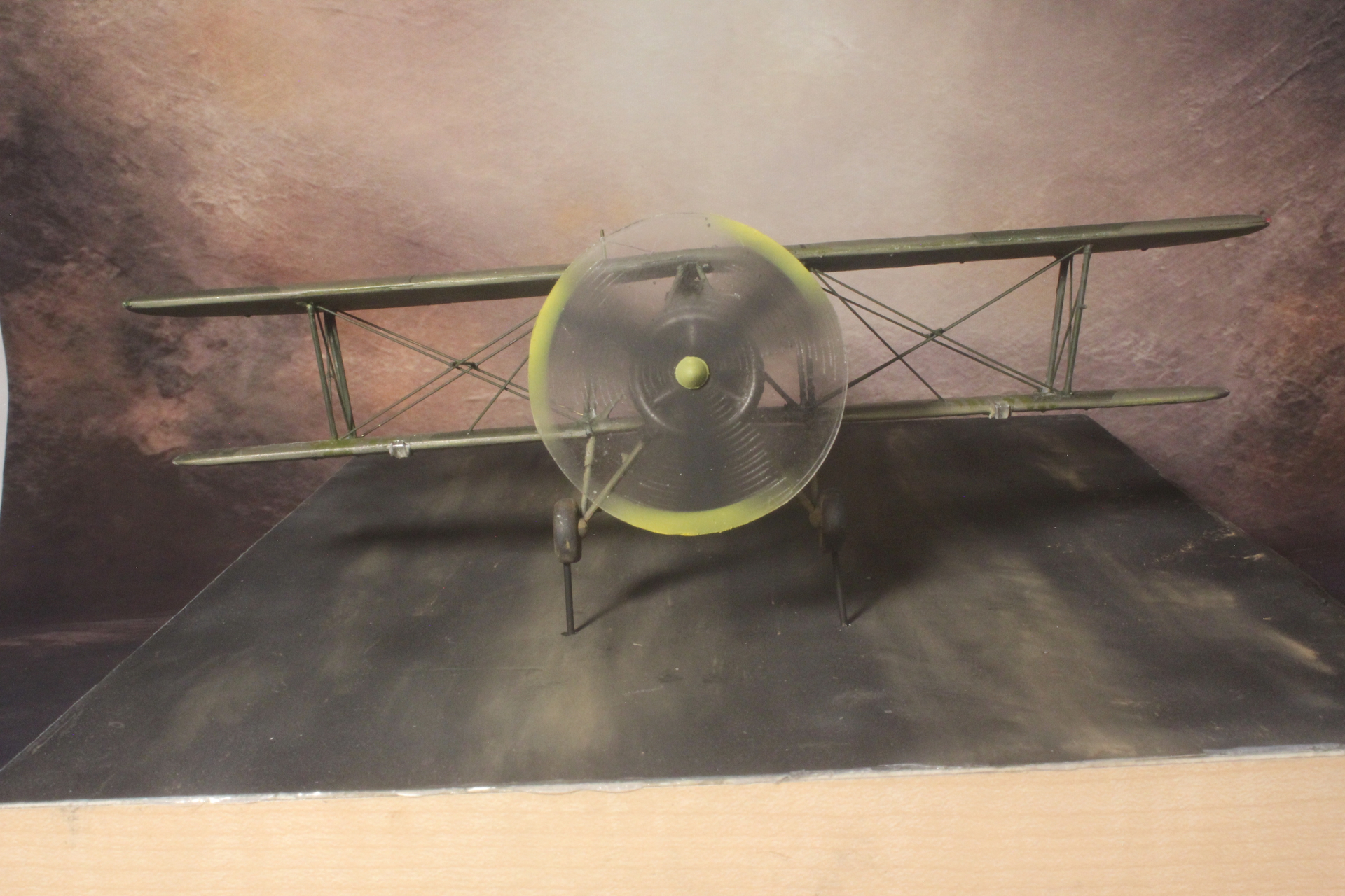 Serendipity! I used an 800 grit (VERY fine) aluminum oxide sandpaper to simulate an asphalt (tarmac) surface and brushed on dust pigments for dirt. Probably because of the grit surface it trapped the pigments and it didn’t spread around evenly, but it did present an appearance of motion blur.