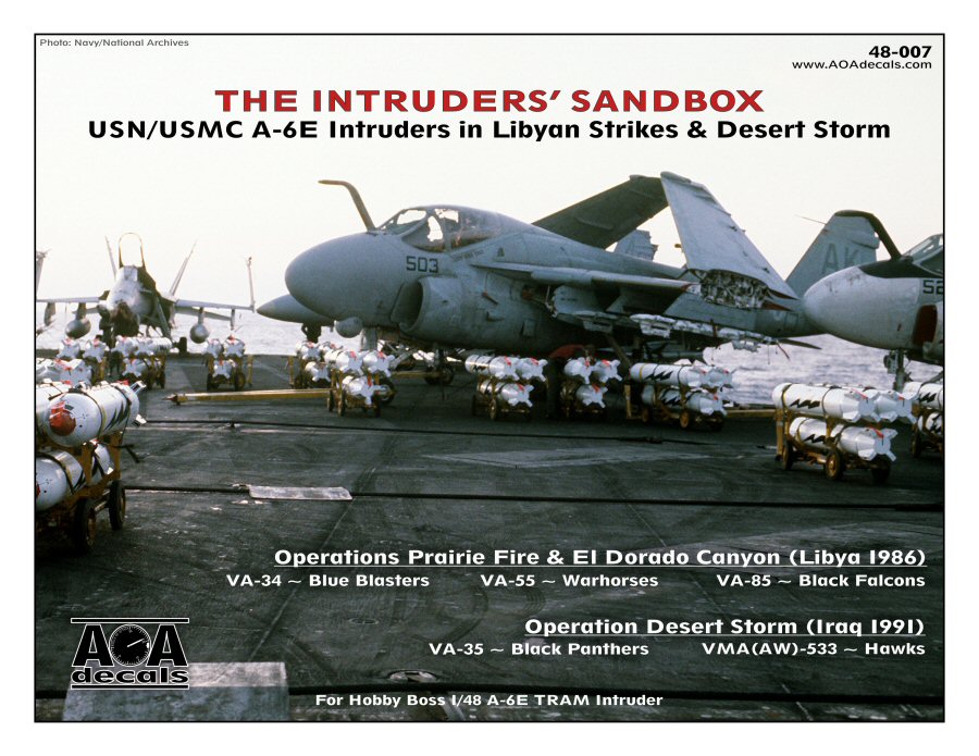 Offered for sale or trade is a new, 1/48 scale AOA Decals 48007 ‘The Intruders’ Sandbox’ USN/USMC A-6E Intruders in Libya & Desert Storm decal set.