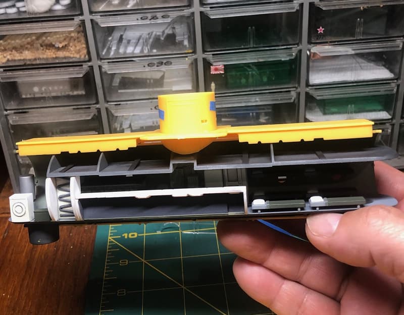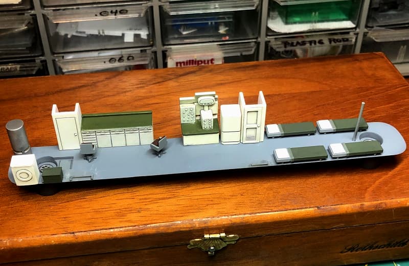 There aren’t many photographs of SEALAB III’s interior, so I mostly just assembled and painted the kit parts as per the instructions. This is the “lab area” with work bench and chairs. The cylindrical fitting on the left is the hot water tank, and I added a brass handwheel to the access hatch below.