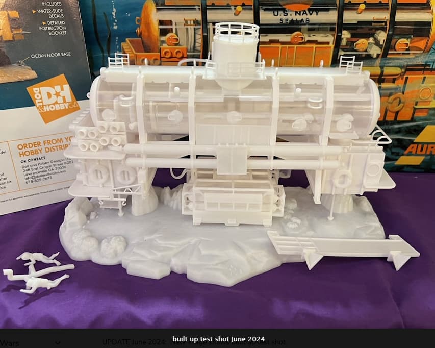Always an innovative company, Aurora Plastics Corporation released a 1/93 scale model of SEALAB III in 1970. Although heavily promoted, the oddball effort was not a commercial success. The kit is perhaps best known for its use by George Lucas’ Industrial Light and Magic to detail various models for the original Star Wars movie. Released only once, it has become a collector’s item. No one seems to know what became of the original tooling; the molds may have been among those lost in the infamous Binghamton NY train wreck, or they may have been among the some 500 molds scrapped after Monogram bought Aurora’s assets in 1978. Anyway, complete kits have become extremely rare and can be found on auction sites going for $500 or more.