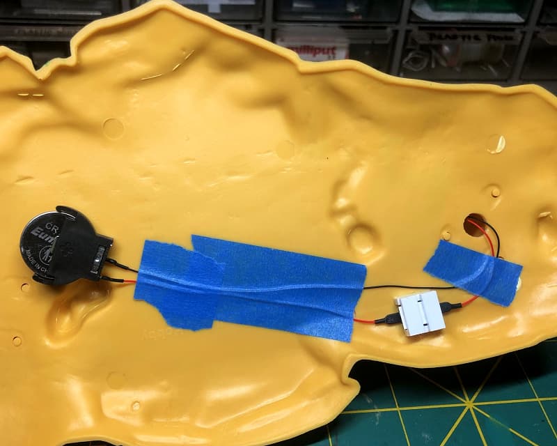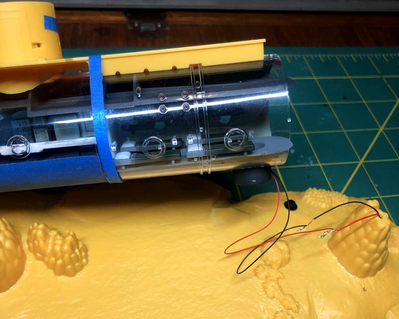 Passed down through the access hatch below, the wires run through the “seaweed” support column down to the 3 volt DC coin cell holder under the sea base.