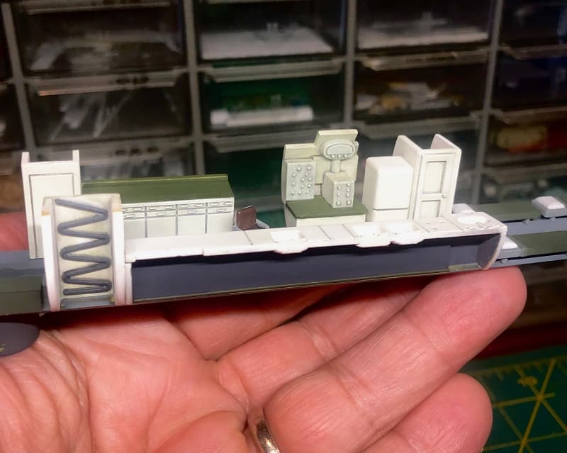 I attached the umbilical connection plugs and painted the points where various grabs, ports, and other fittings will go, and the last two berths were fitted to the inside of the casing. Before securing it I gave the inside a last careful cleaning to remove any dust or stray particles – there will be no reaching anything in there once it is sealed up!