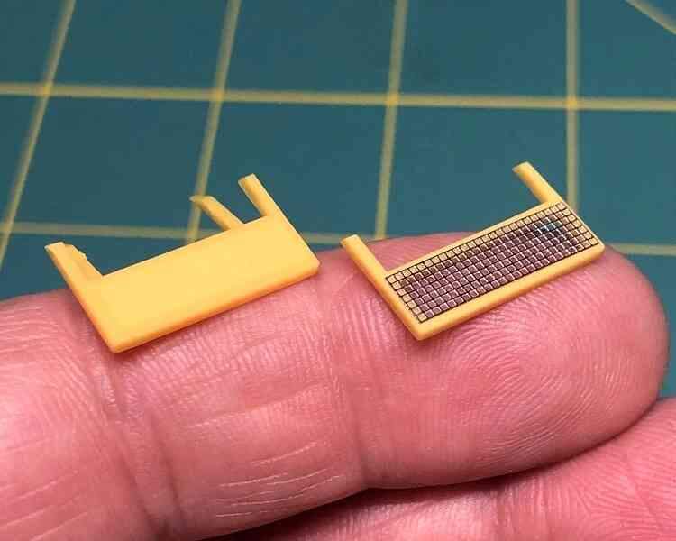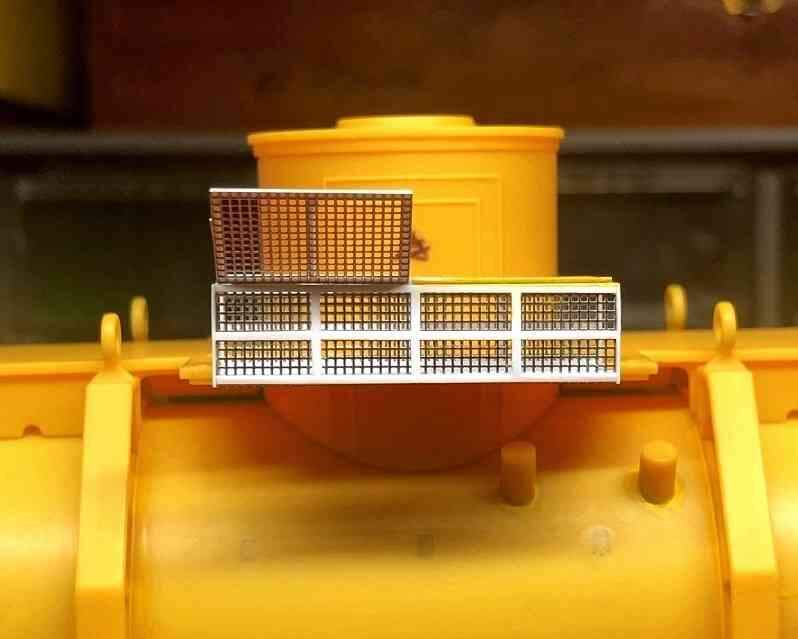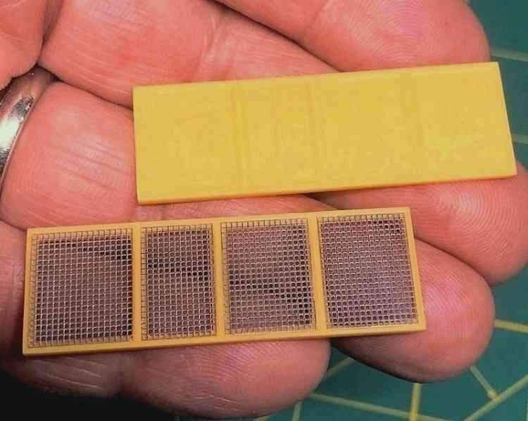 … but in the end I just couldn’t resist replacing those screens! After prying the cages loose from the recently assembled side tanks, I trimmed away the molded screens and replaced them with new ones cut from 0.5 X 0.5mm stainless steel etch stock.