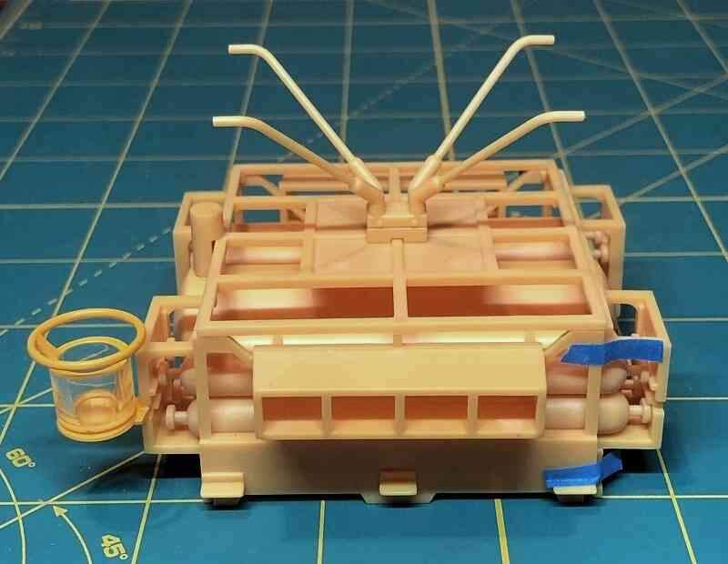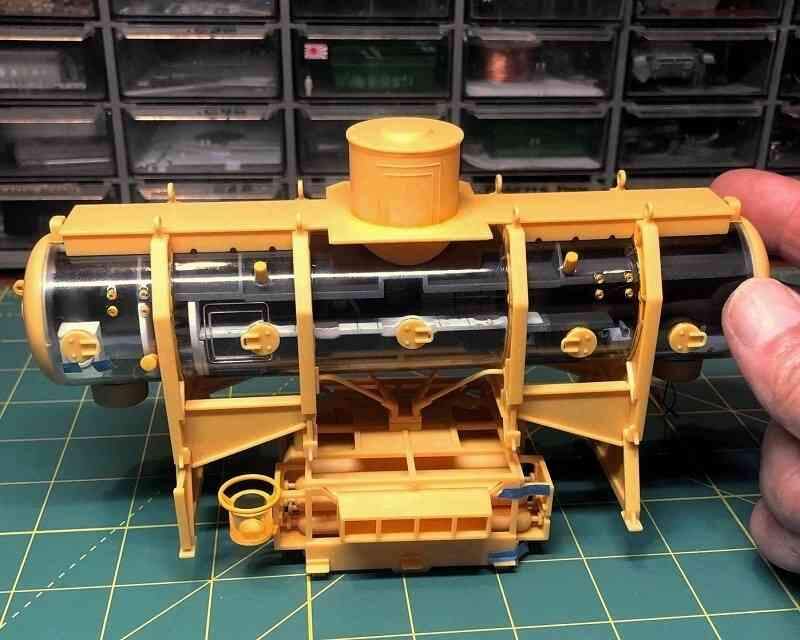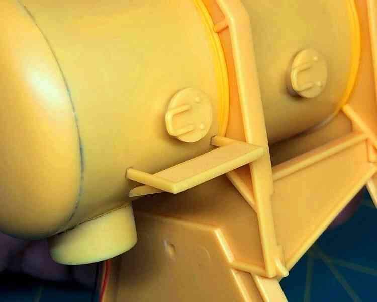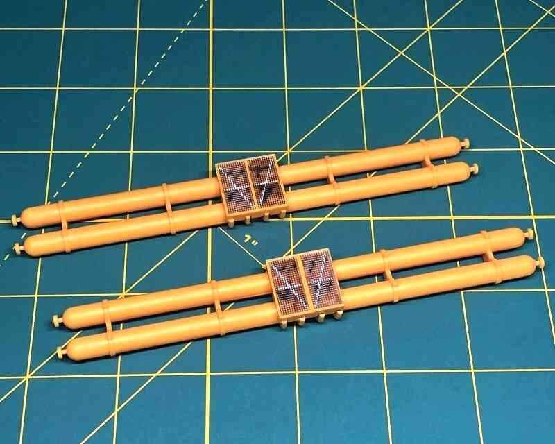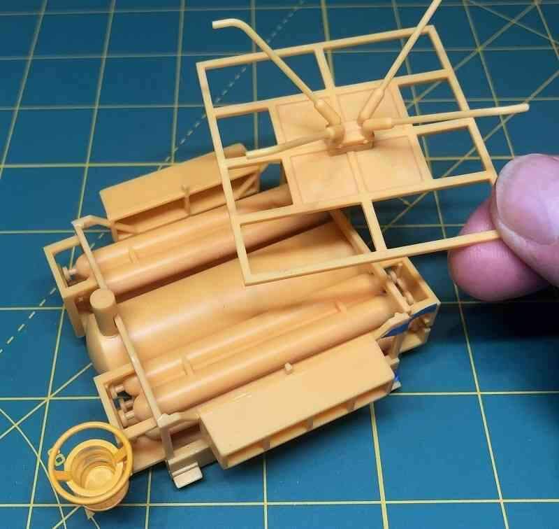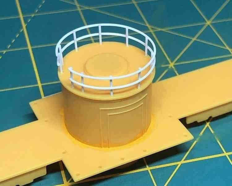 I also cleaned up and test fit the railings. The round rails atop the cylindrical ballast tank No. 1 were a simple, cleanly molded two-part assembly that fit perfectly.