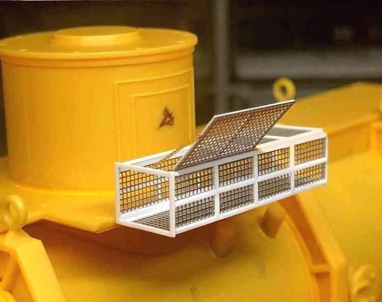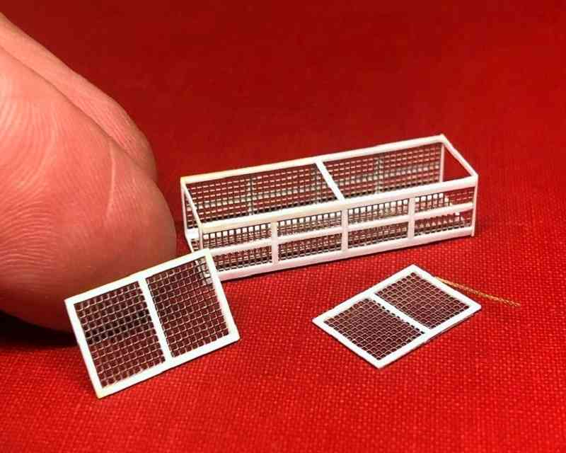 The real cage had two hinged covers; I thought it might be a fun to show one of them open. The tiny retaining chain is some etched brass anchor cable left over from a 1/700 scale destroyer project.