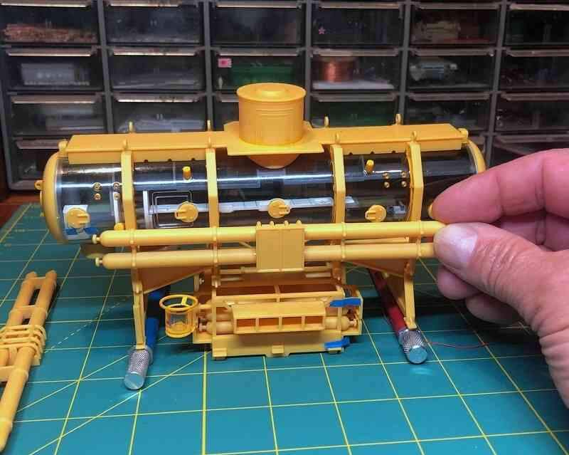 I had decided at the outset of this project to forgo any scratchbuilding and just go with the Old School look of Aurora’s 1960s SEALAB model. The molded plastic renditions of the screens over the junctions of the side tanks, for example, were pretty good, so the plan here was to bring out the mesh detail with a dark wash…