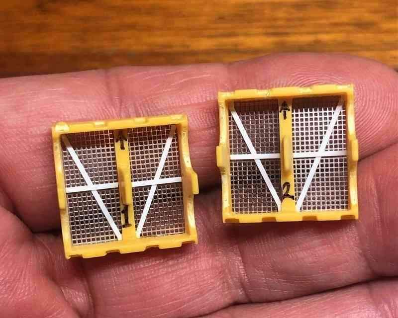 After the rough cuts I went back and trimmed the plastic more closely to the frames and cut more of the etched stainless steel mesh to fit inside them. Plastic cement doesn’t work on metal, but it did soften the surfaces of the plastic frames just enough to hold the screens in place.