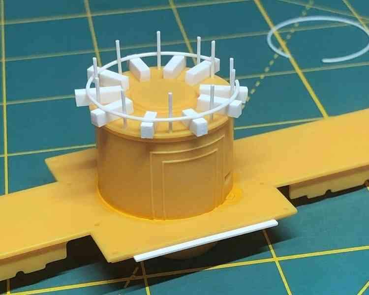 Still, the kit platform rails look pretty good, so I opted to just redo the ballast tank rails to go along with them. Plastruct .025 inch (.6mm) styrene rod is a good match, so I used this to make the stanchions.
