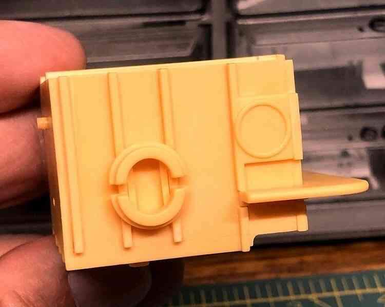The new etched screen covers over the side tank junction boxes look good, but having impulsively replaced these means that leaving the molded plastic screens on other parts would now look odd… which I hadn’t properly considered. Oh well, committed now, so…