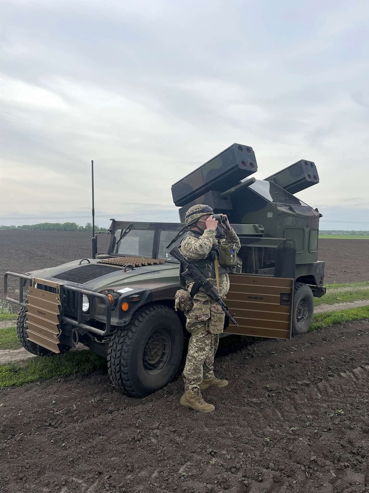 The command and control vehicle, which includes radar for target detection, electro-optical/infrared sensors, and electronic warfare capabilities to defeat unmanned aircraft systems (UAS) and provide situational awareness for the pair.