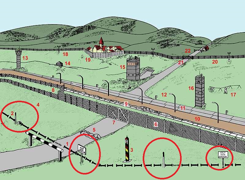 As mentioned before, I life next the former border. As a kid, my parents took frequently to the border. The was a spot called “Eisfelder Blick” with the obligatory Streckmetallzaun and a Wachturm in the background. Before the fence, were posts painted white with “bavarian” blue tips. The posts marks the border, not the fence behind. DDR Grenzanlagen, especially in Berlin, were very deep, with a wide Niemandsland, to prevent “Grenzdurchbrüche.”