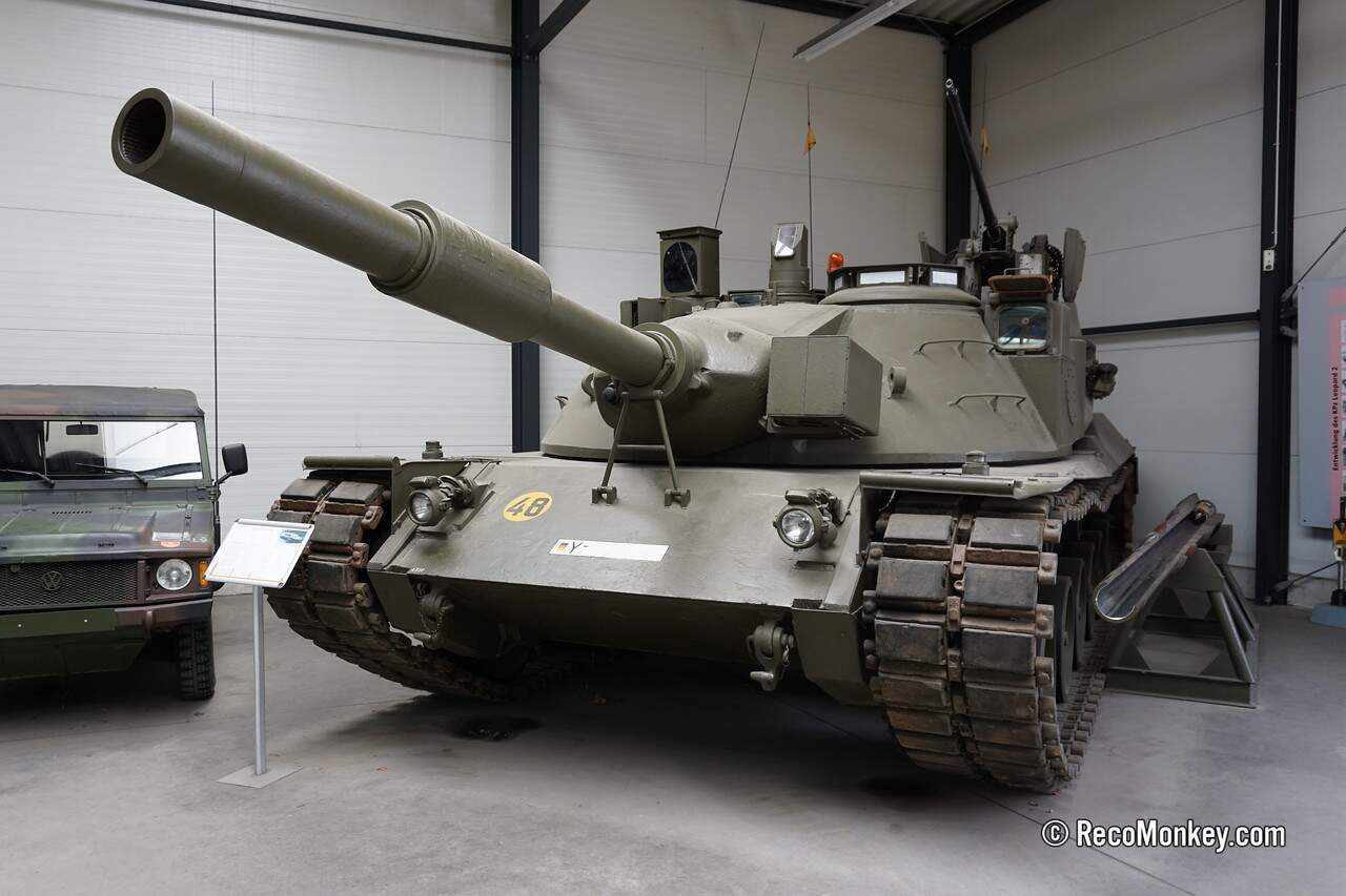 This is a first-generation German prototype: you can see the square sides to the engine deck, which housed the folded-down snorkels, and the stowage bins at the front corners, both of which make it an early tank, as well as German lights and smoke grenade launchers. I’m guessing it’s PT 1 or PT 2, because PT 3 already had sloping sides to the engine deck, though with a small grille in them.