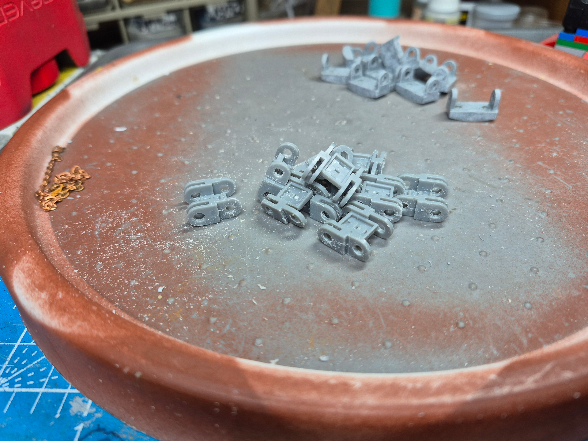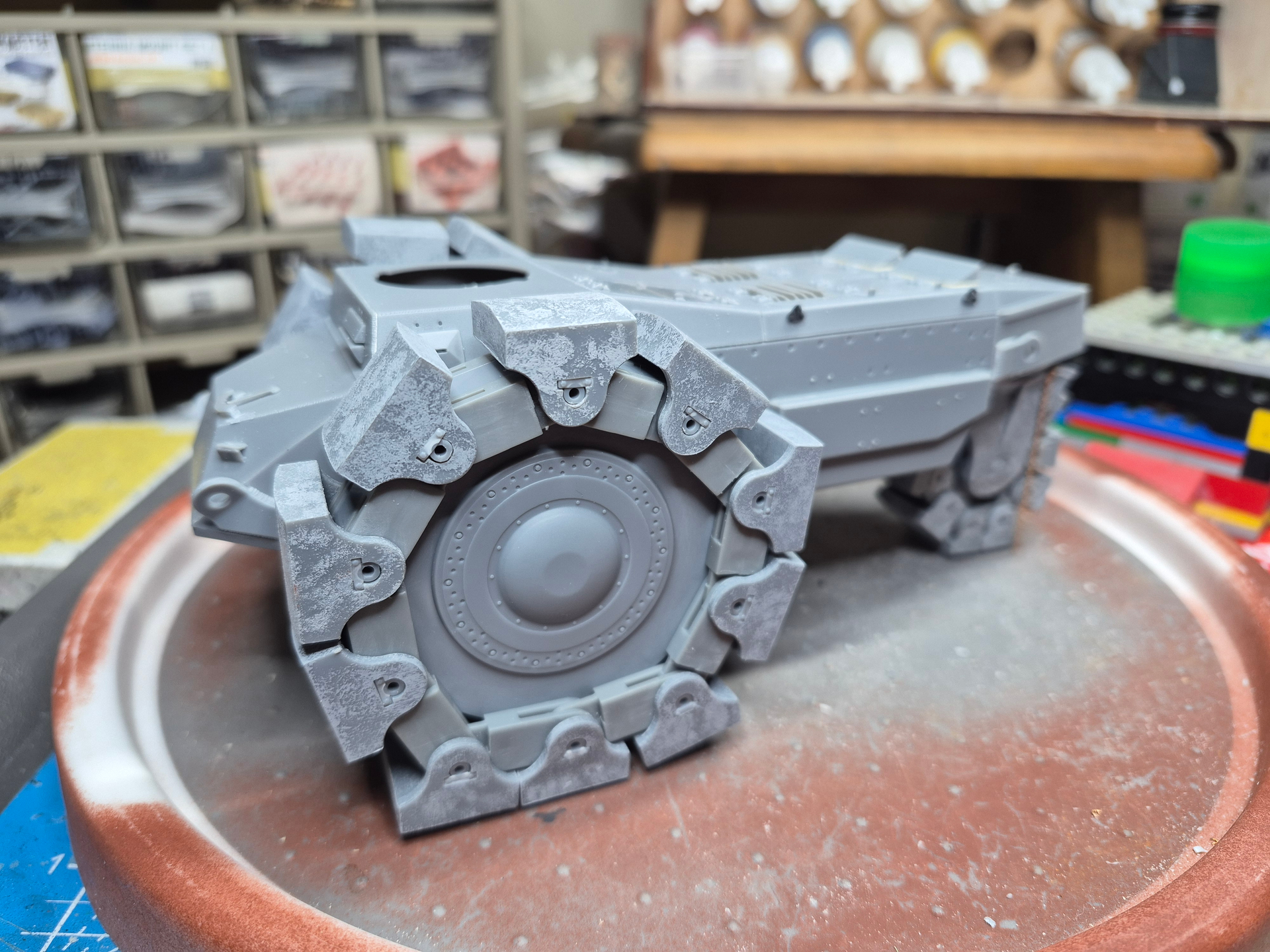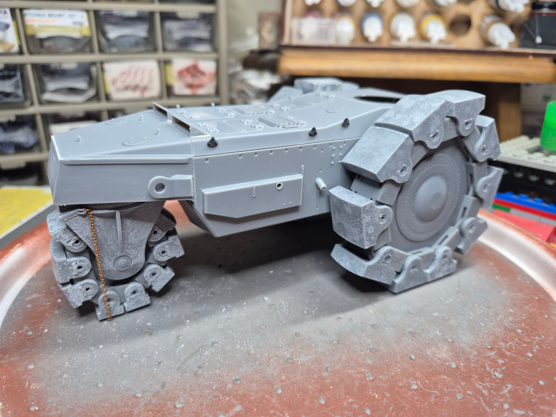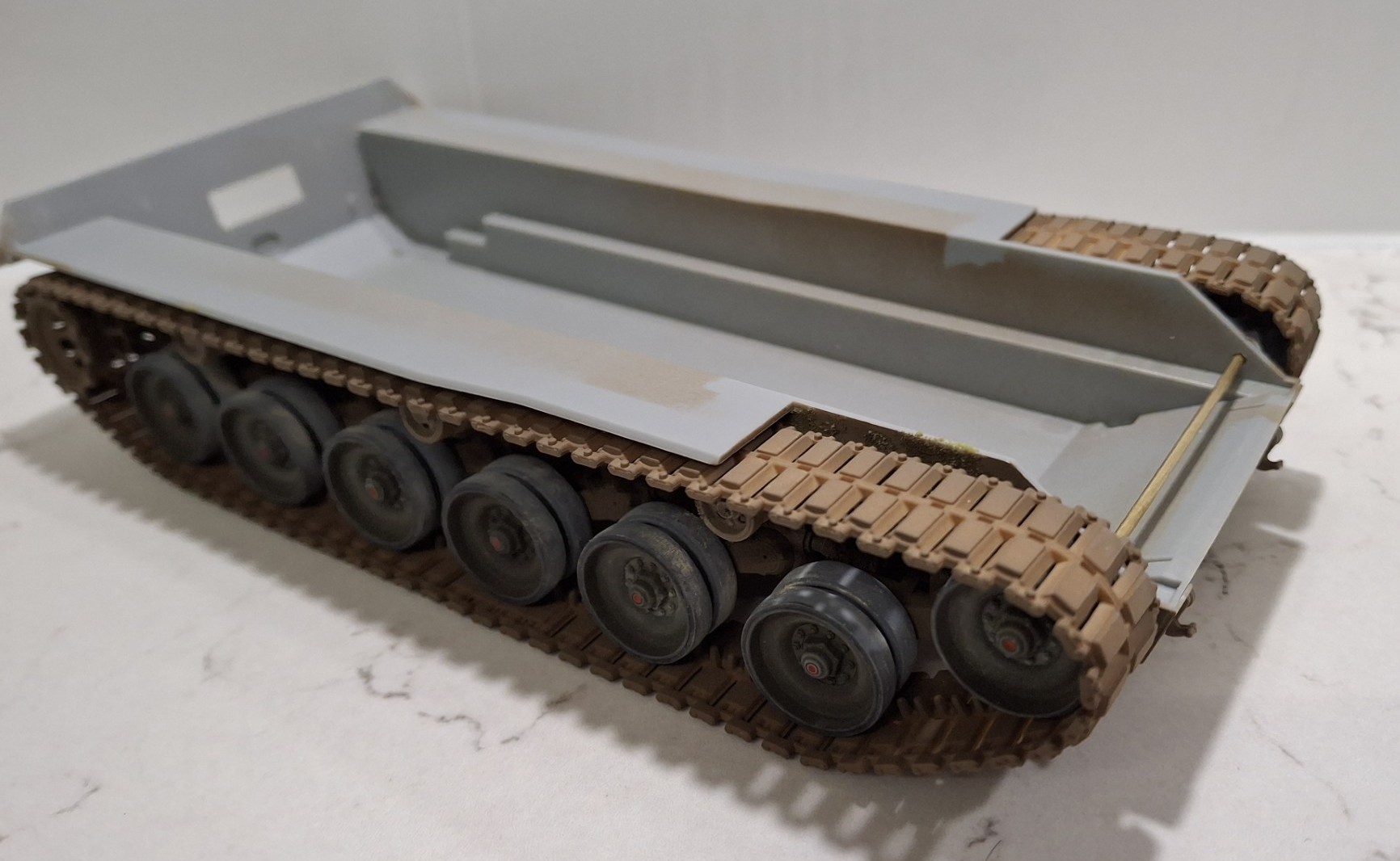 Next stop the tracks; I’ve left off the idlers just in case the Dragon tracks are a poor fit and I have to use separate tracklinks, which will mean I’ll need the idlers free so I can tighten them accordingly.