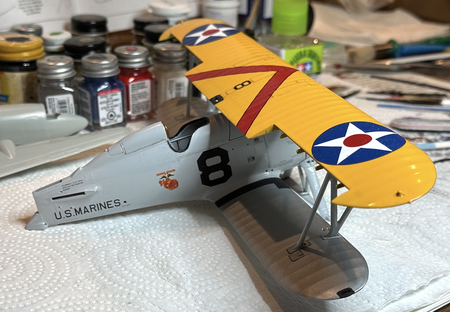 Interesting issue – My reference book has large beuatiful pictures of many F4B details including factory shots showing the top & bottom wings. These pictures show how Boeing painted the surfaces.