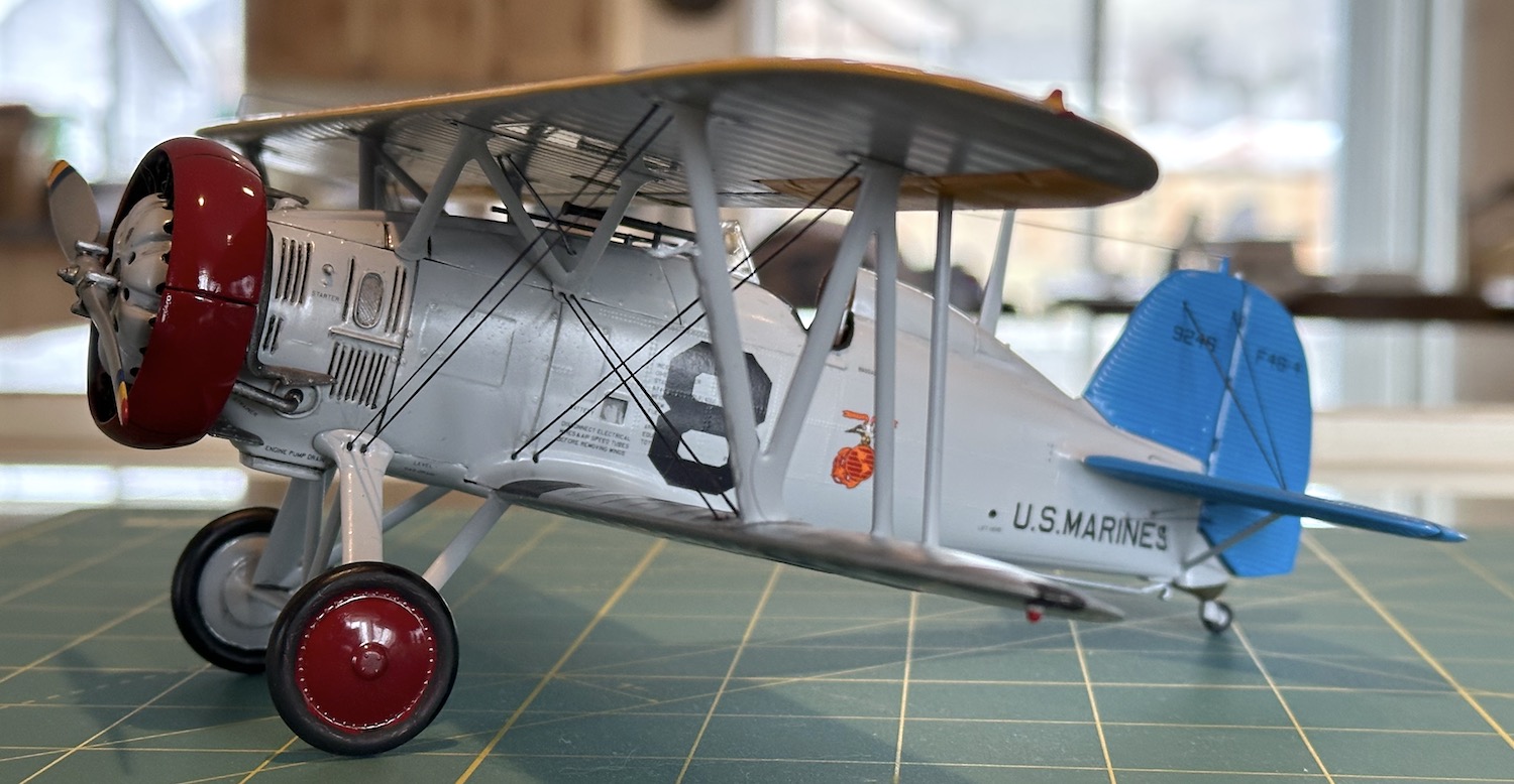 Here are some more pictures of the F4B before it goes into the display case. This last one shows off the scale thickness of the wings. There are uncomfortable separations between the upper & lower halves of those wings that leave a seam that looks awkward. I thought I could live with it better than losing the fabric detail to filling and sanding but my next build, the Hase 1/32 Curtiss BF2C-1 which has already been started will have those panel lines filled even at the cost of the detail. We’ll see which looks better.